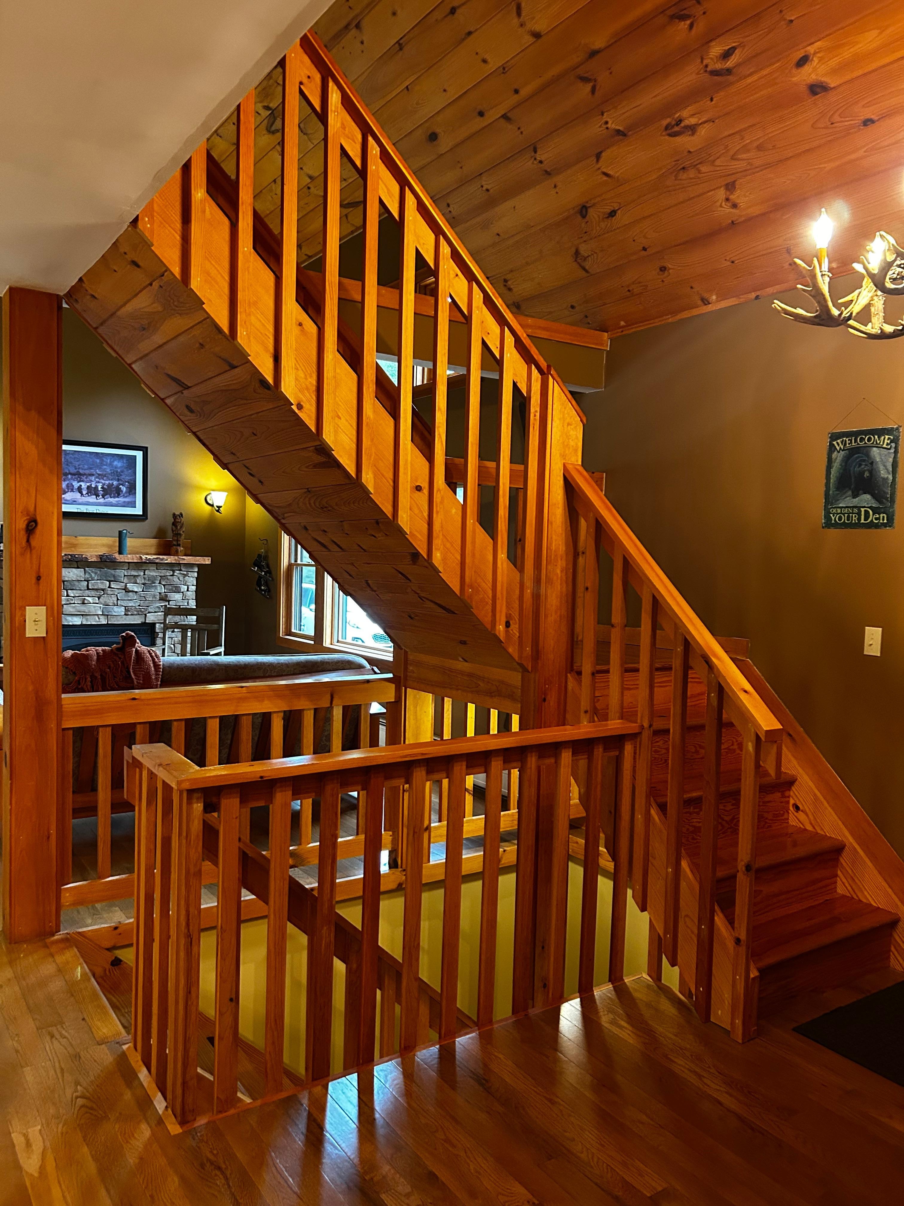 A mile and a half from the Whiteface Mountain Ski Center, Bear Den Chalet is a brand new 3 bedroom, two and a half bath vacation home. Bear Den Chalet comfortably sleeps six in bedrooms, but can accommodate up to 6 other guests on very thick comfortable futons, including one on a second floor landing, and two in the finished basement where the wide screen TV is. Linens, cooking and eating utensils, Cable TV, cable modem for high speed internet access, and DVD, make Bear Den Chalet a relaxing home away from home. Seasonal chills are kept out with radiant floor heating. All you need to bring with you are clothes, food, ski gear, hiking gear or fishing poles.
