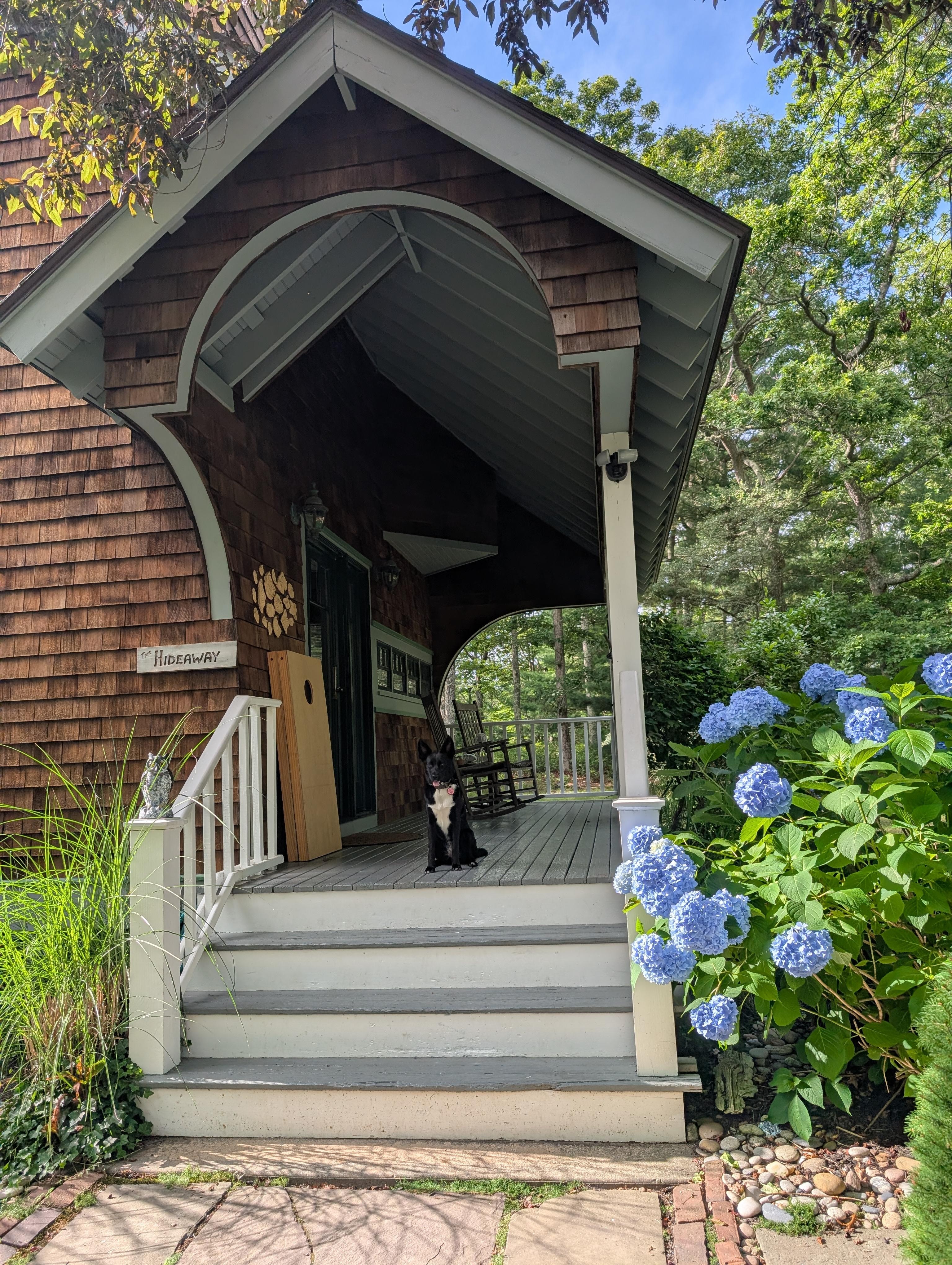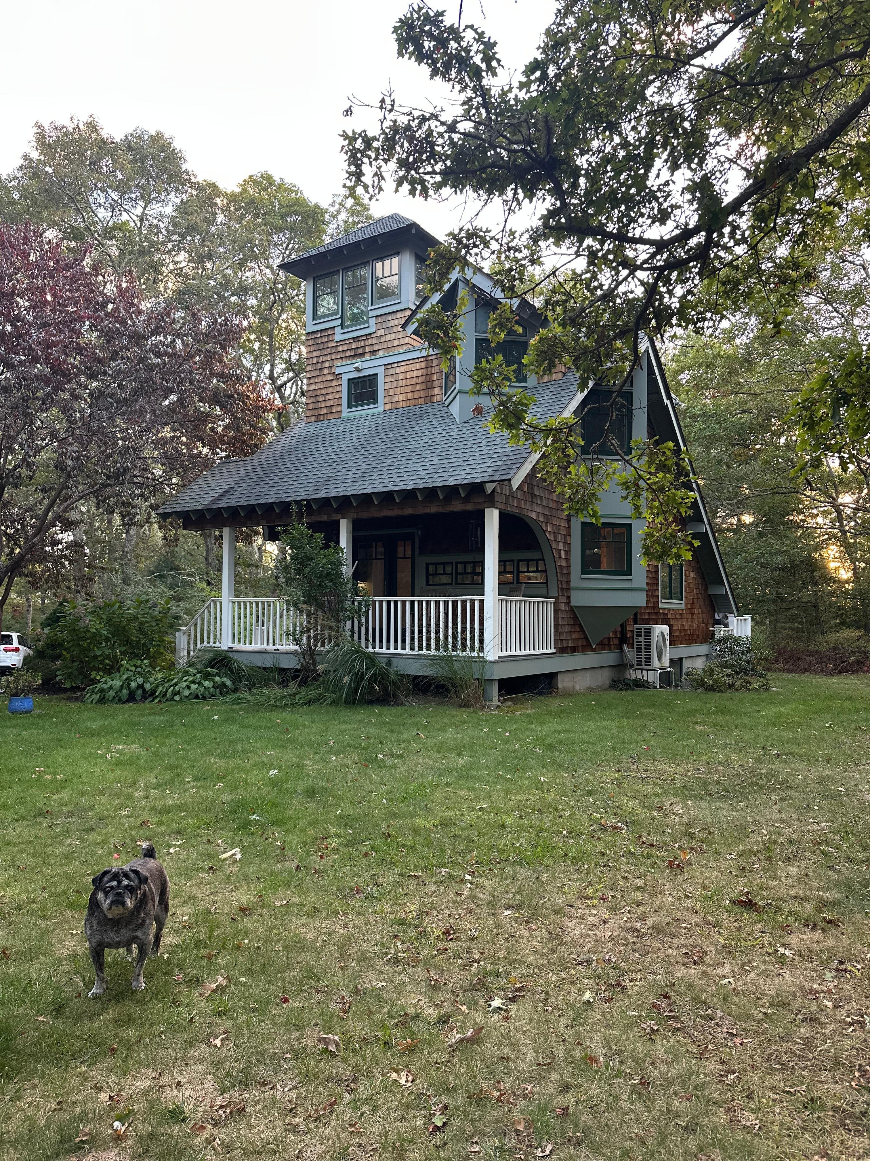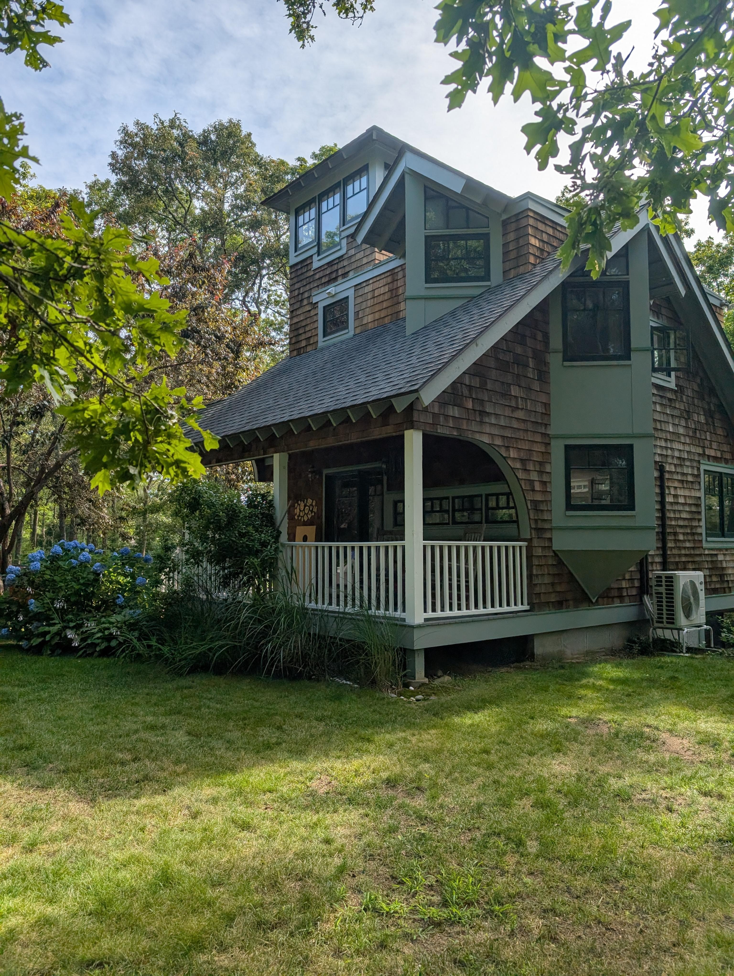 Featured in Fine Homebuilding and RI Monthly magazines, this award-winning Custom Designed Saltbox has sweeping lines, curved details and asymmetrical angular features. The living area feels large due to the wide-open living room and kitchen, opening on one end to the deck and on the other to the front porch with classic rocking chairs. With live-edged Walnut countertops, custom cabinetry, open shelving, and stainless appliances, this uniquely laid out kitchen allows for intimate cooking or open entertaining. The Living room/Dining area features a large table for six and a comfortable sitting area with a sleeper sofa. A half bath and the large deck finish off the first floor. Ascend the staircase to the two bedrooms with their unique angles & high ceilings, The Master has a queen bed, dresser, and custom built-in closet. The other bright bedroom has bunk beds. The intimate bath with small soaking tub completes the second floor. There is also a large finished basement with a sleeper sofa and space for indoor games and puzzles (of which there is a substancial selection). The first and second floors are air conditioned with a system that was recently installed. Situated on the top of a hill 3.5 miles from Charlestown Beach, the 5+ acre property has its own walking trails and offers tremendous privacy. Off the front porch there is a new outdoor shower, kids play set, a fire pit with seating, and a hammock. On the back deck there is a sitting area, grill, and a large open air dining space. With just enough lawn area to play games, this house makes a great getaway!