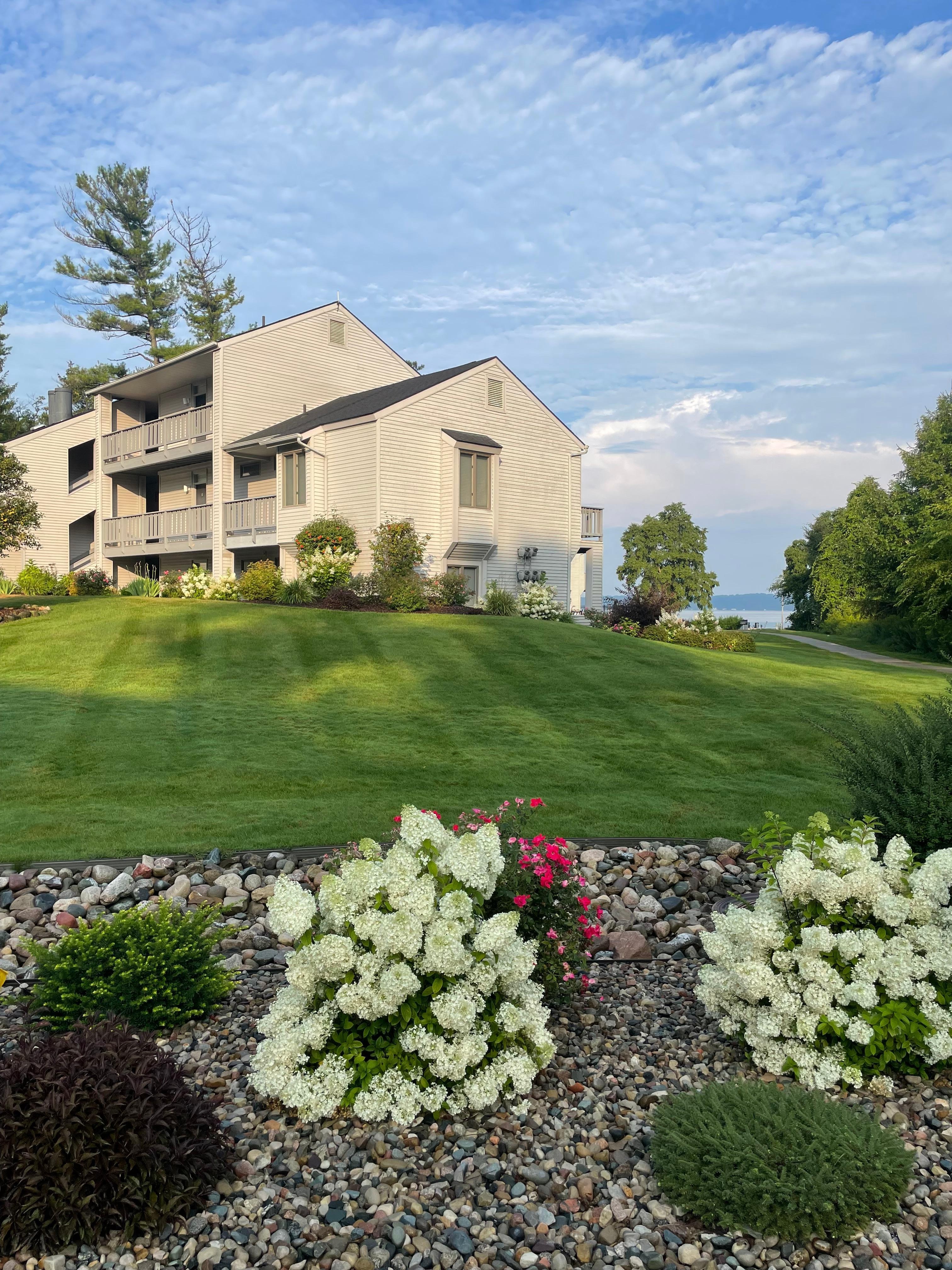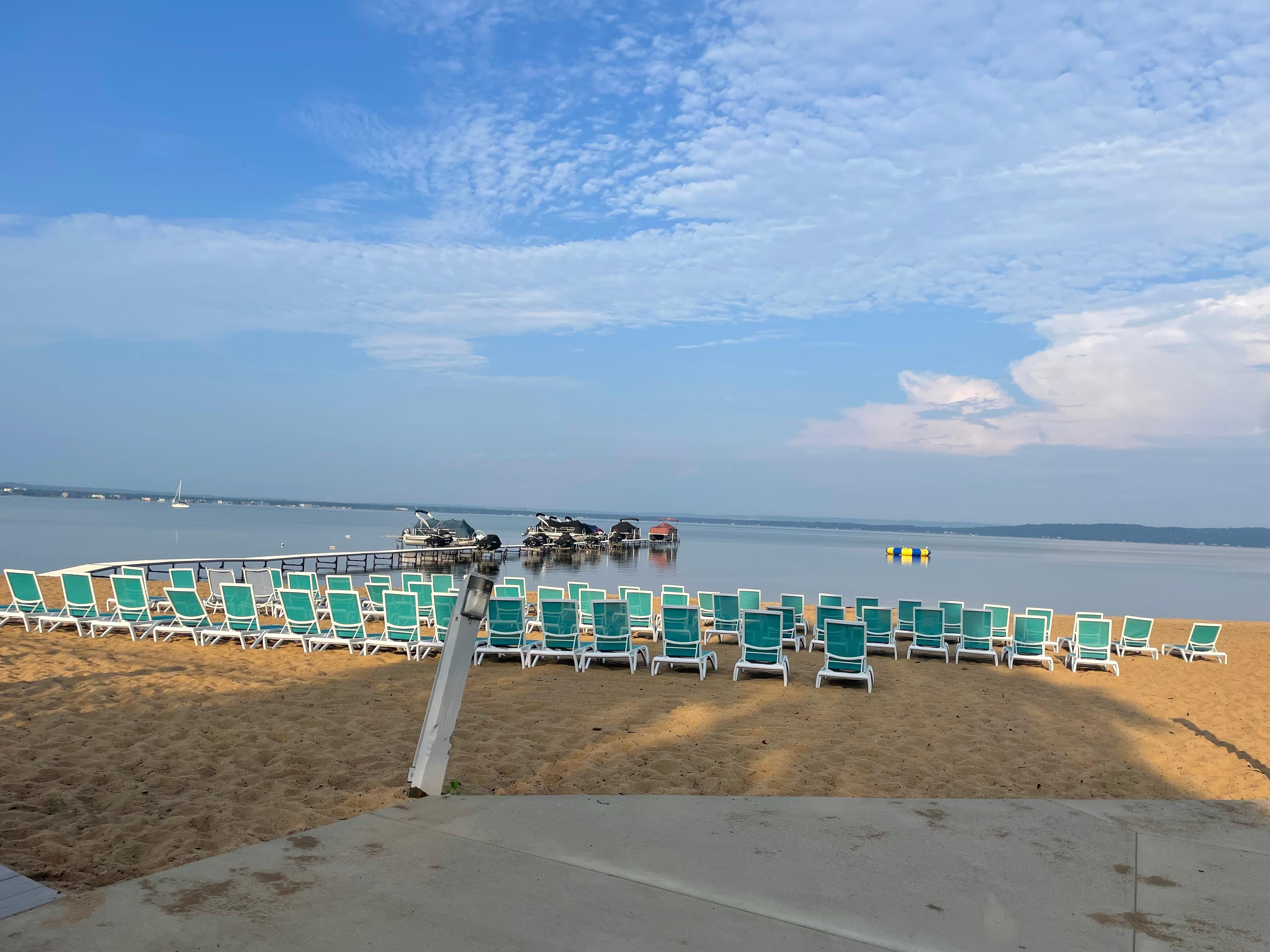 Top floor studio unit. Updated colors, new luxury vinyl plank flooring and Westin Heavenly mattress and box spring! Vaulted ceilings with great views of Grand Traverse Bay and Acme Creek. Queen bed and pull out sofa sleeper. Great space and value for a family with children. Kitchenette with mini fridge, range burners, and microwave. This unit is a beach lovers dream!