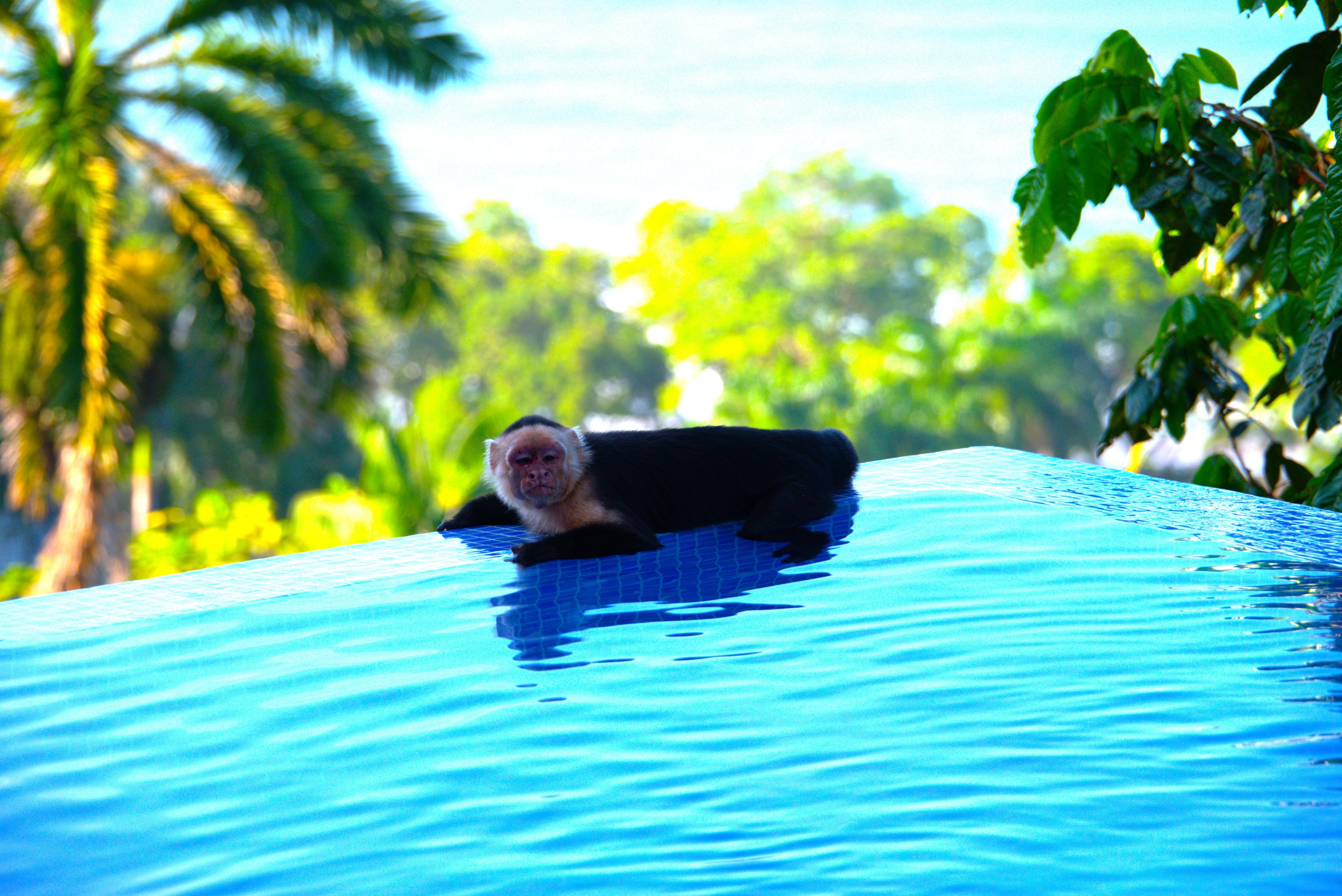 Nestled within a protected wildlife corridor near Manuel Antonio National Park, Vista Oceana is a luxury villa surrounded by lush tropical jungle, where nature visits you daily. Imagine waking up to the sights and sounds of three species of monkeys—Capuchin, Howler, and the endangered Mono Titi—along with playful sloths, colorful toucans, majestic macaws, parrots, pelicans, agoutis, and dazzling iguanas. Hundreds of bird species have been spotted from the balconies, and if you're lucky, you might even catch a glimpse of a mother whale and her calf just offshore.