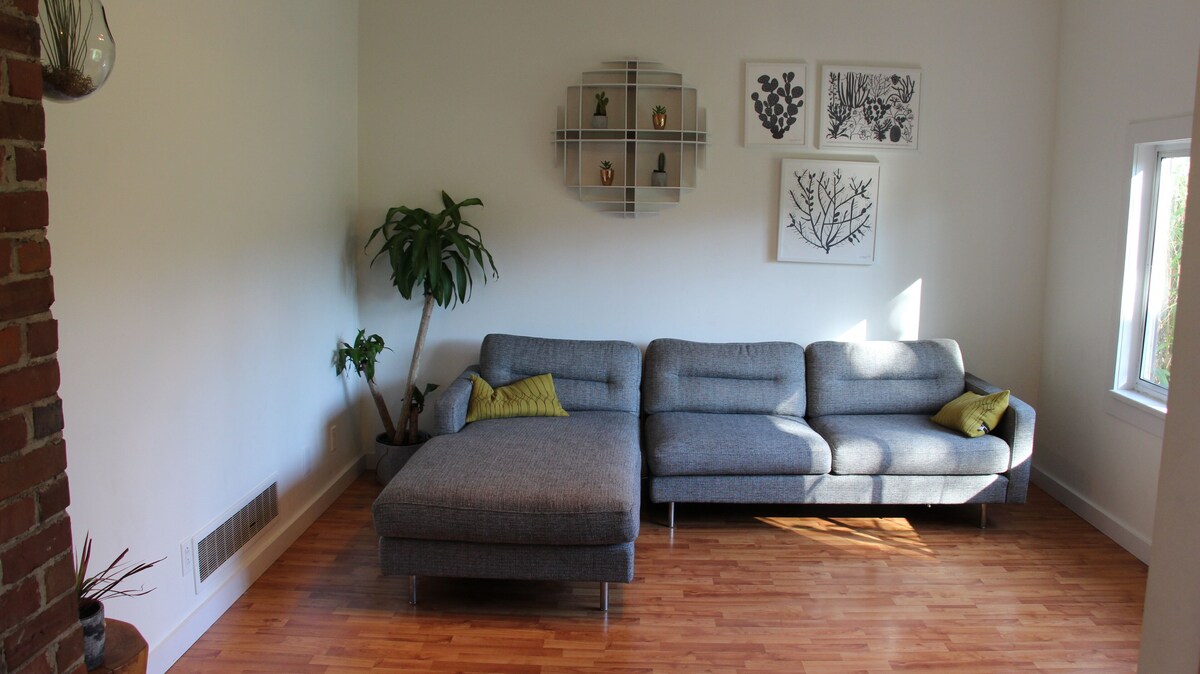 Our 1500 square foot home takes up the two upper floors of a character house. Our main floor consists of a bright & sunny living room (modern designer furniture with a Gus Modern sectional and Nelson Saucer lighting), a minimalist dining room (with a table that can seat up to eight people), a spare room/office (with a Bo Concept fold down couch that makes a double bed with mattress topper), a fully renovated bathroom (with bath), a recently renovated kitchen with cement counter tops, all new high end stainless steel appliances (gas stove, fridge/freezer, microwave, juicer, espresso machine, soda stream, Vitamix etc.) and a back porch with a Weber bbq and stairs that lead to the yard.