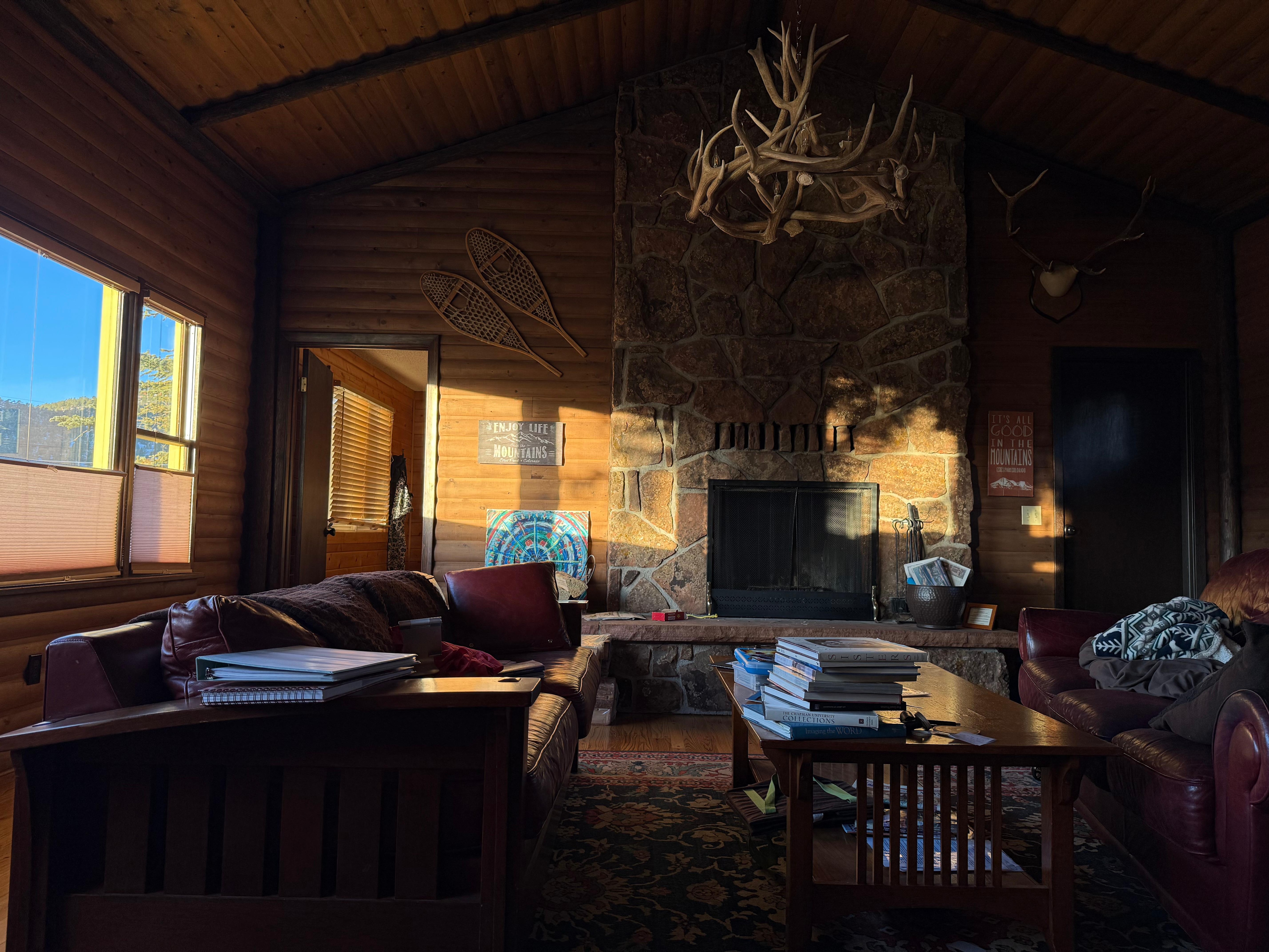 Awesome views of the Rocky Mountains and wildlife wandering through the front yard are yours from this clean and comfortable, vintage cabin. Conveniently located less than a mile from the Rocky Mountain National Park entrance and within a mile from the heart of downtown Estes Park, you can come home after a fun day of hiking, shopping, or exploring and relax in the spacious living room by the wood-burning moss-rock fireplace (you can purchase firewood bundles from nearby Safeway or Ace hardware). The living room also has two cozy leather couches, leather chair with ottoman, coffee table, elk horn chandelier, flat screen TV with Amazon Firestick to access your own streaming subscriptions, DVD player, and wireless Internet service. We have added fur pillows and fur throw blankets in the living room -- we think you’ll love curling up on the leather couches with these!