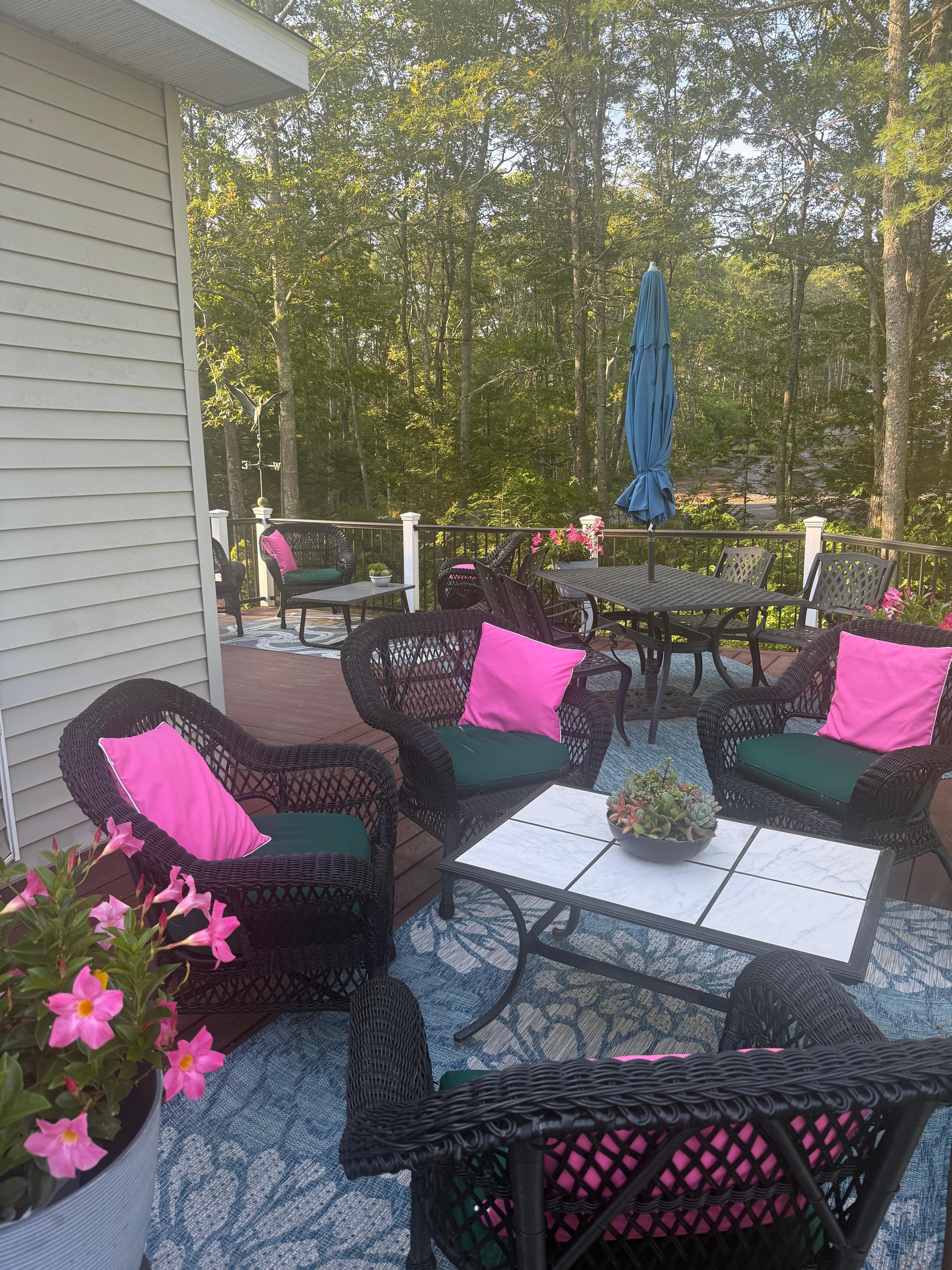 Outdoors there is a Covered Front Porch with chairs and a convenient recycling area. Overlooking the water is a huge deck with 2 umbrellas, a large outdoor dining table with cushioned seating and pub table. There are 6 comfortable wicker chairs for relaxing. You have a Gas Grill, Beach cooler, chairs, towels and beach umbrella for your use.