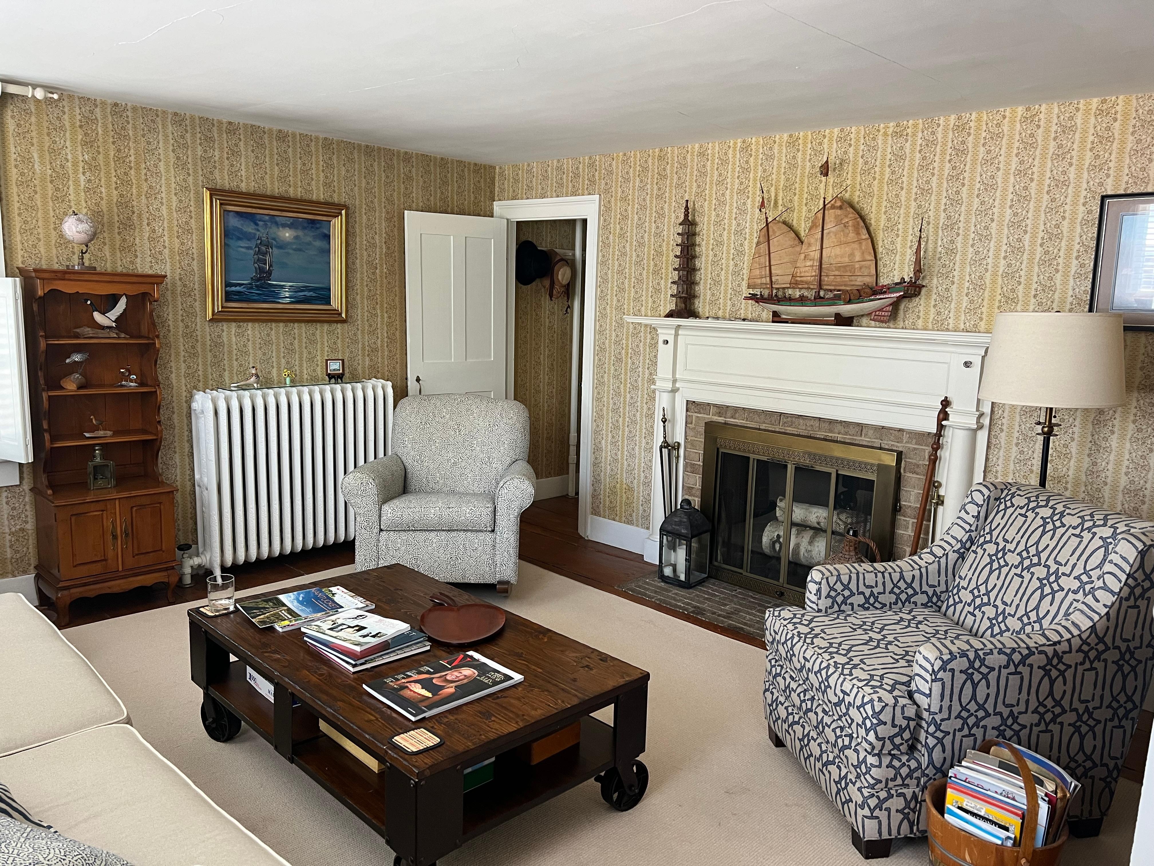Historic Colonial home with back open porch with patio furniture and grill overlooking a lovely backyard. The interior has front hallway with open stairway to second floor, plus back staircase.