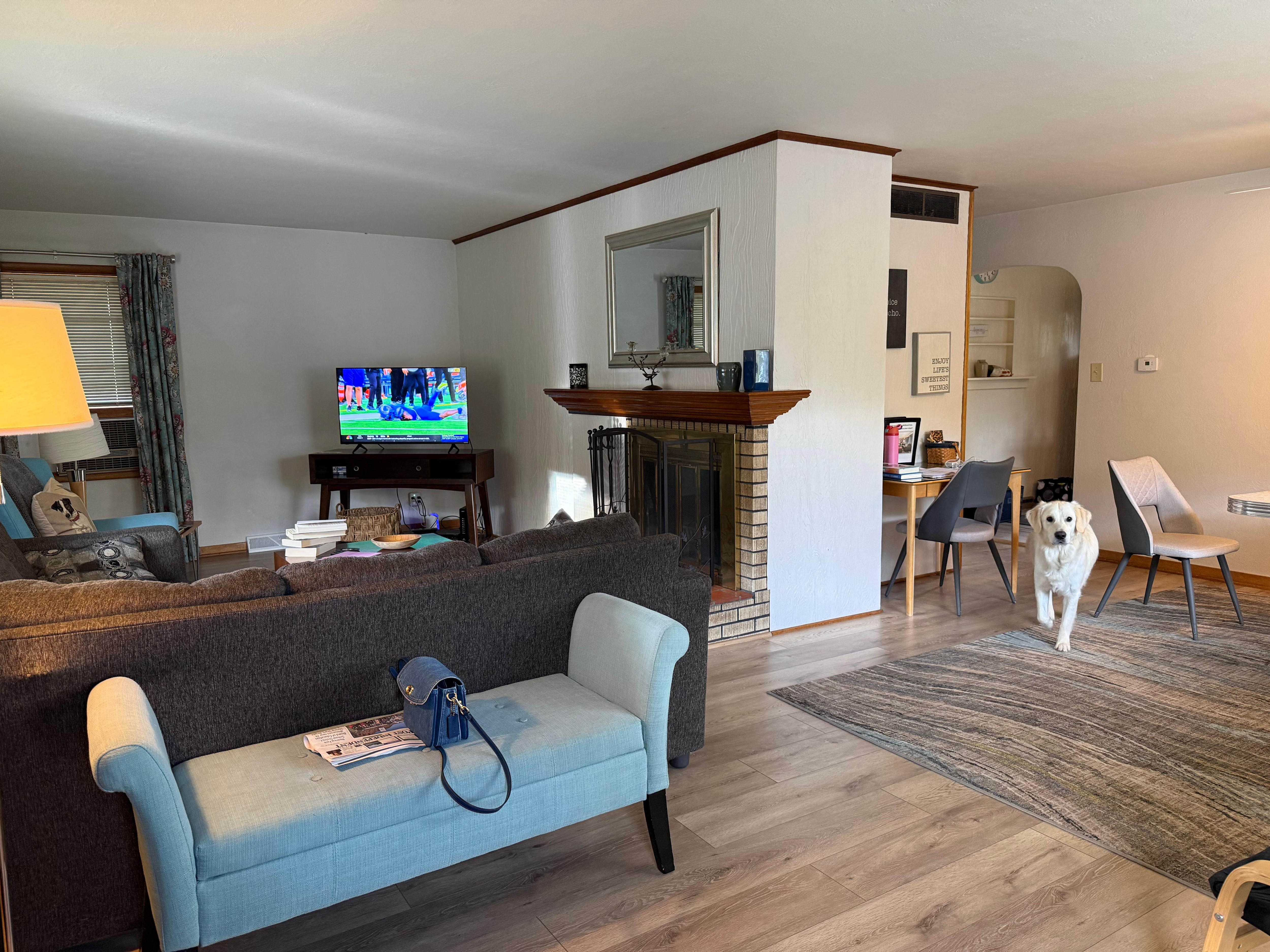 A huge living room with fireplace, games, free high speed internet * Streaming channels. A dining room with dining set, overhead fan, and work desk.