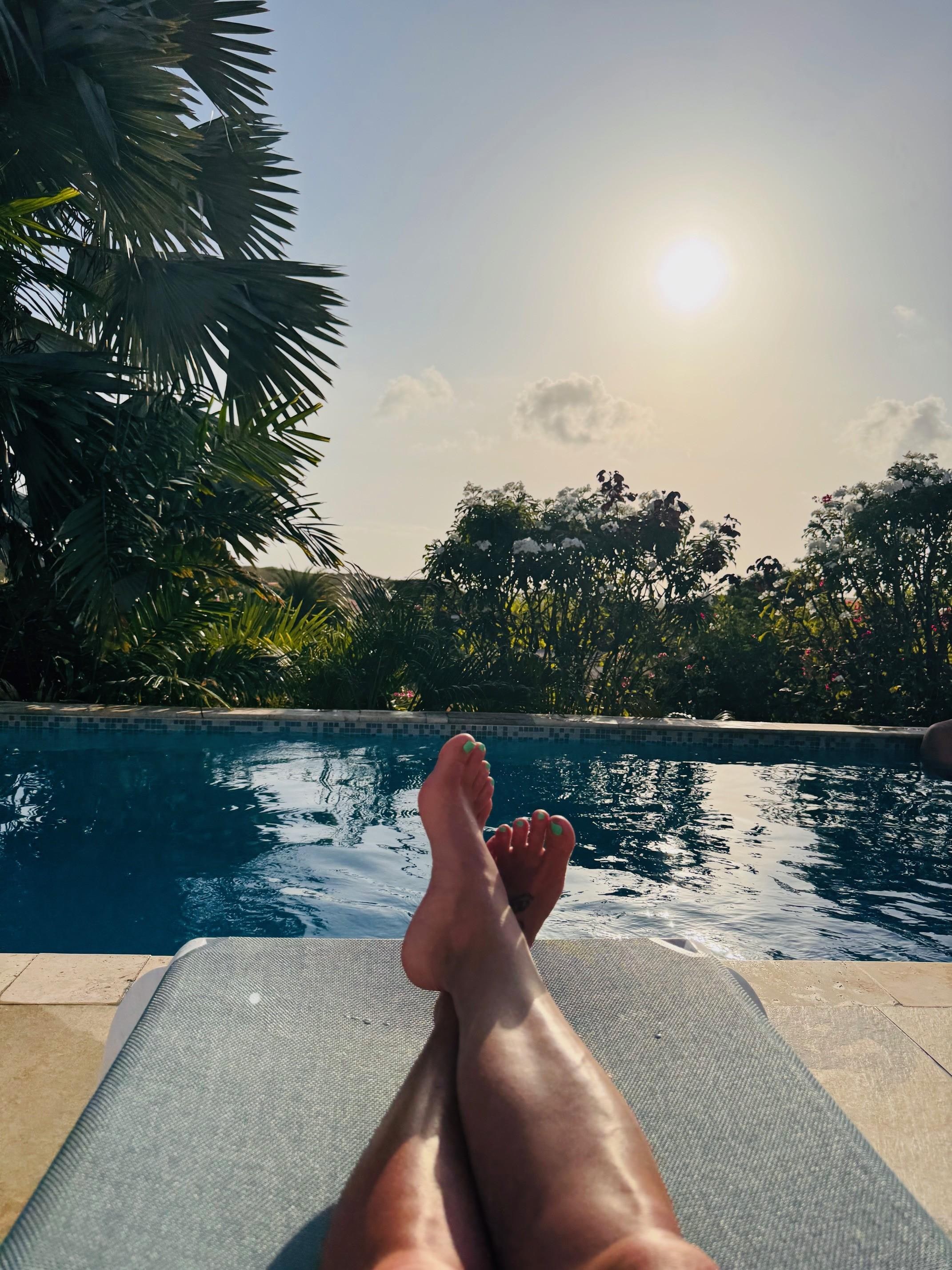 The porch changes into the terrace, with the swimming pool (6 × 3 meters) at its edge. Next to the pool is the second porch with adjoining bathroom. This porch is equipped with a large lounge sofa and hammock. Everywhere there is an unobstructed view of overgrown hills and the Caribbean Sea on the horizon.