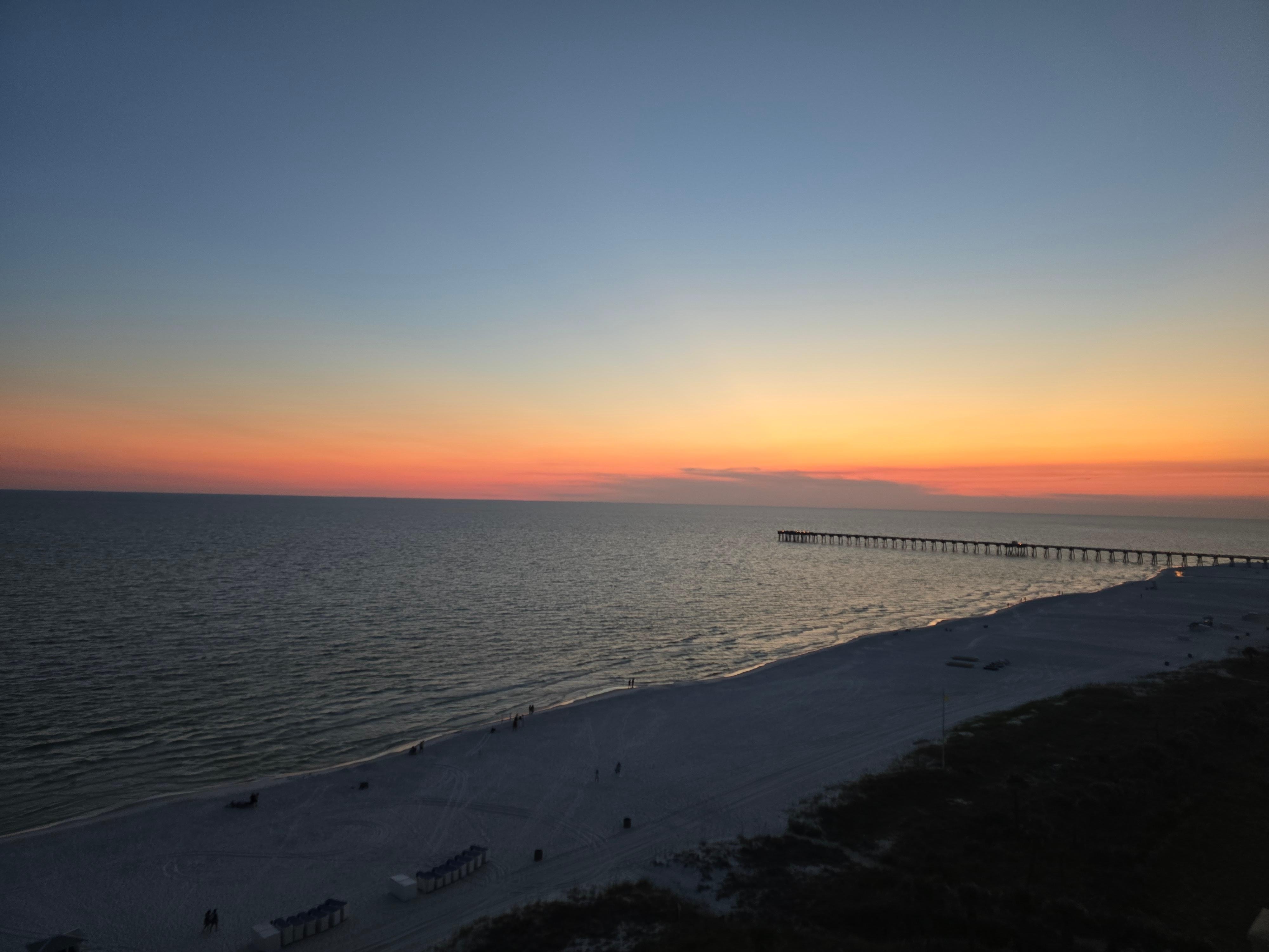 The ocean is seen while sitting on the couch, eating at the dining room table or relaxing in the master suite. The balcony looks out over the Gulf of America, the large swimming pool and the downtown lights of Panama City. Located on the east end of the building, the views are not obstructed by other beach developments. All you see are sunrises, sunsets, the beach, the ocean, the lagoon pool, and the landscaped green space.