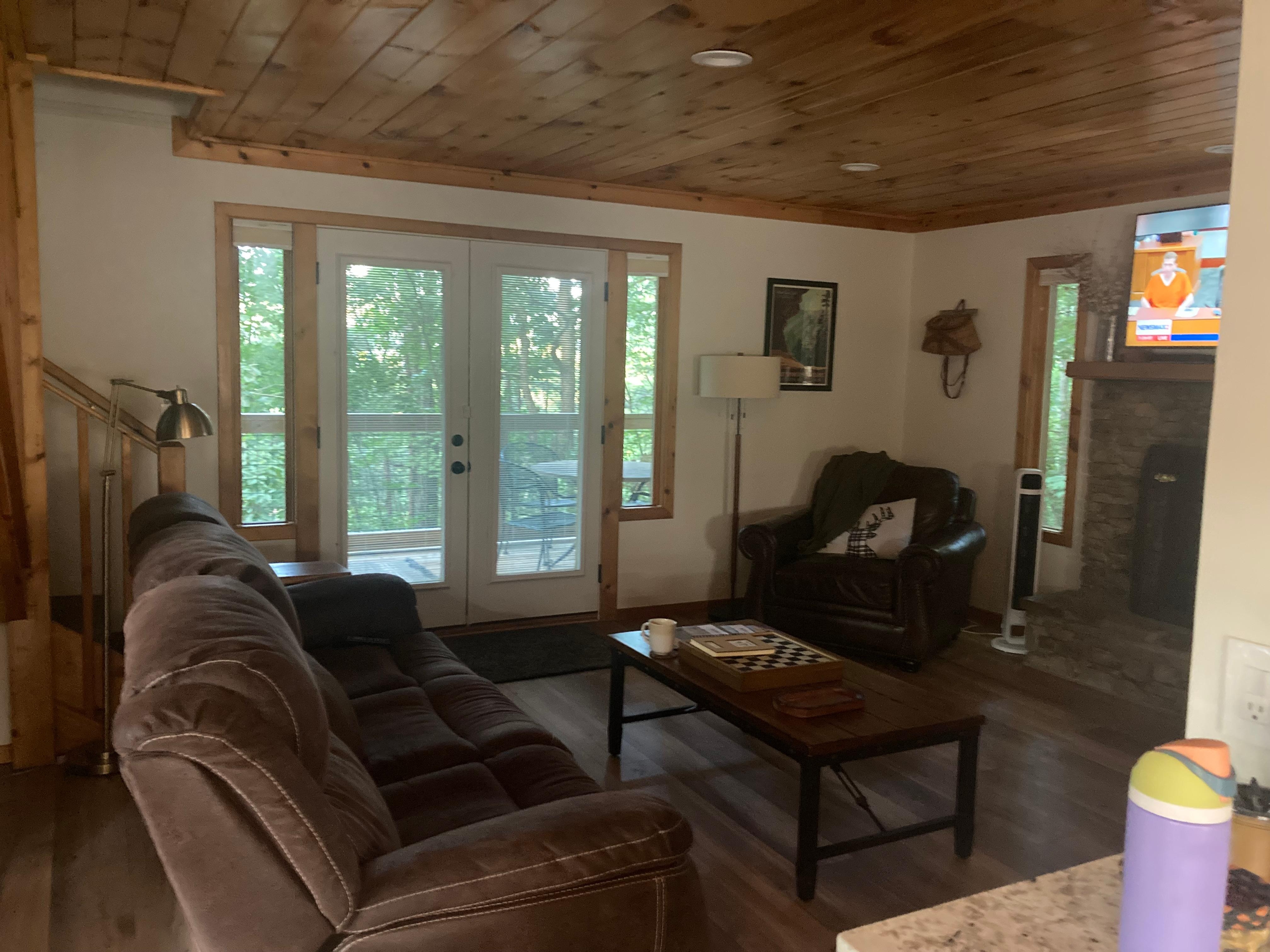 The dining table is adjacent to the kitchen and has pretty views to the woods from the large window. The living area makes up the rest of the main floor. You can put your feet up and relax in one of two recliners in the motion sofa. Or curl up in the leather club chairs. Everyone gets a great seat.