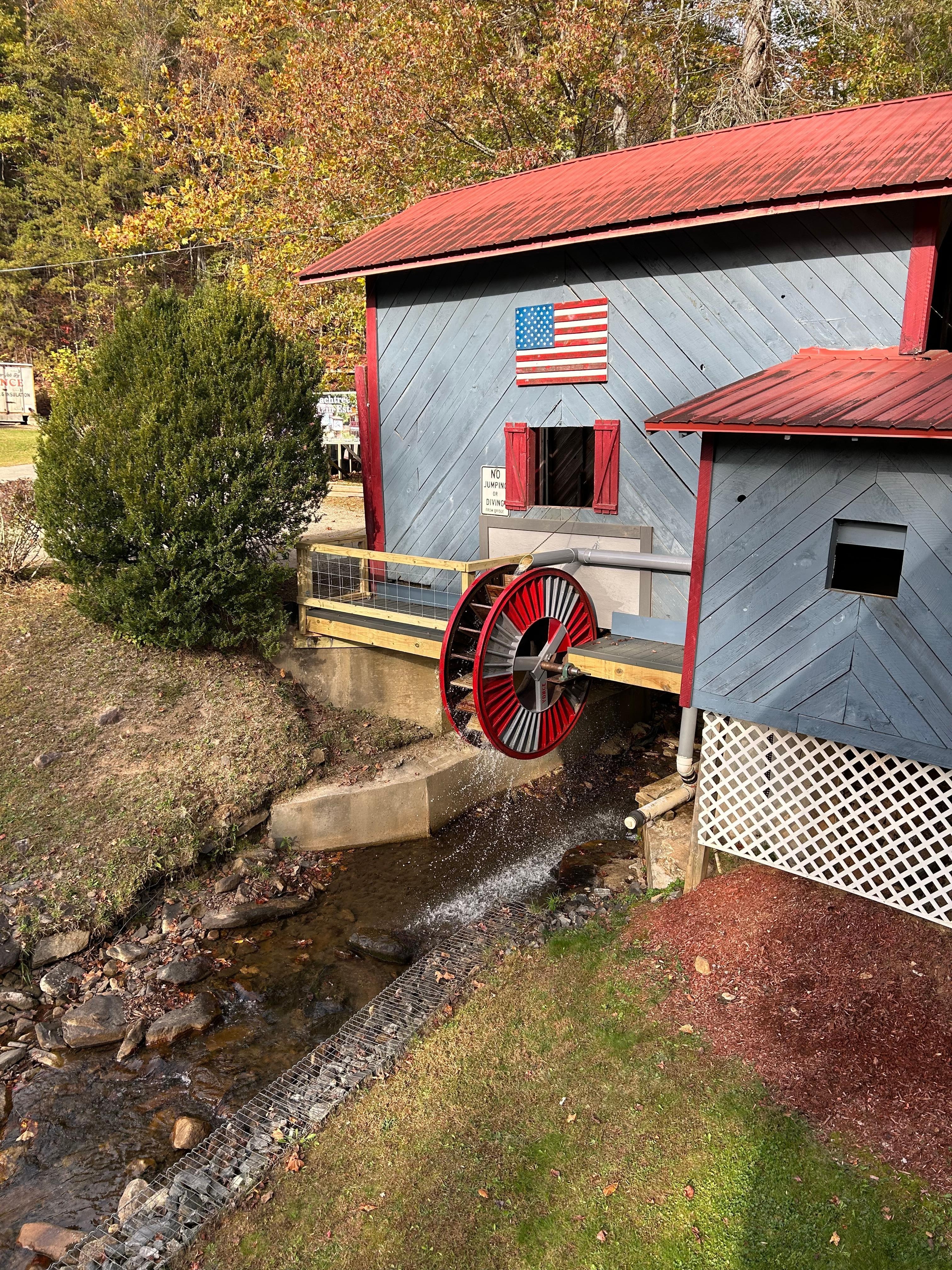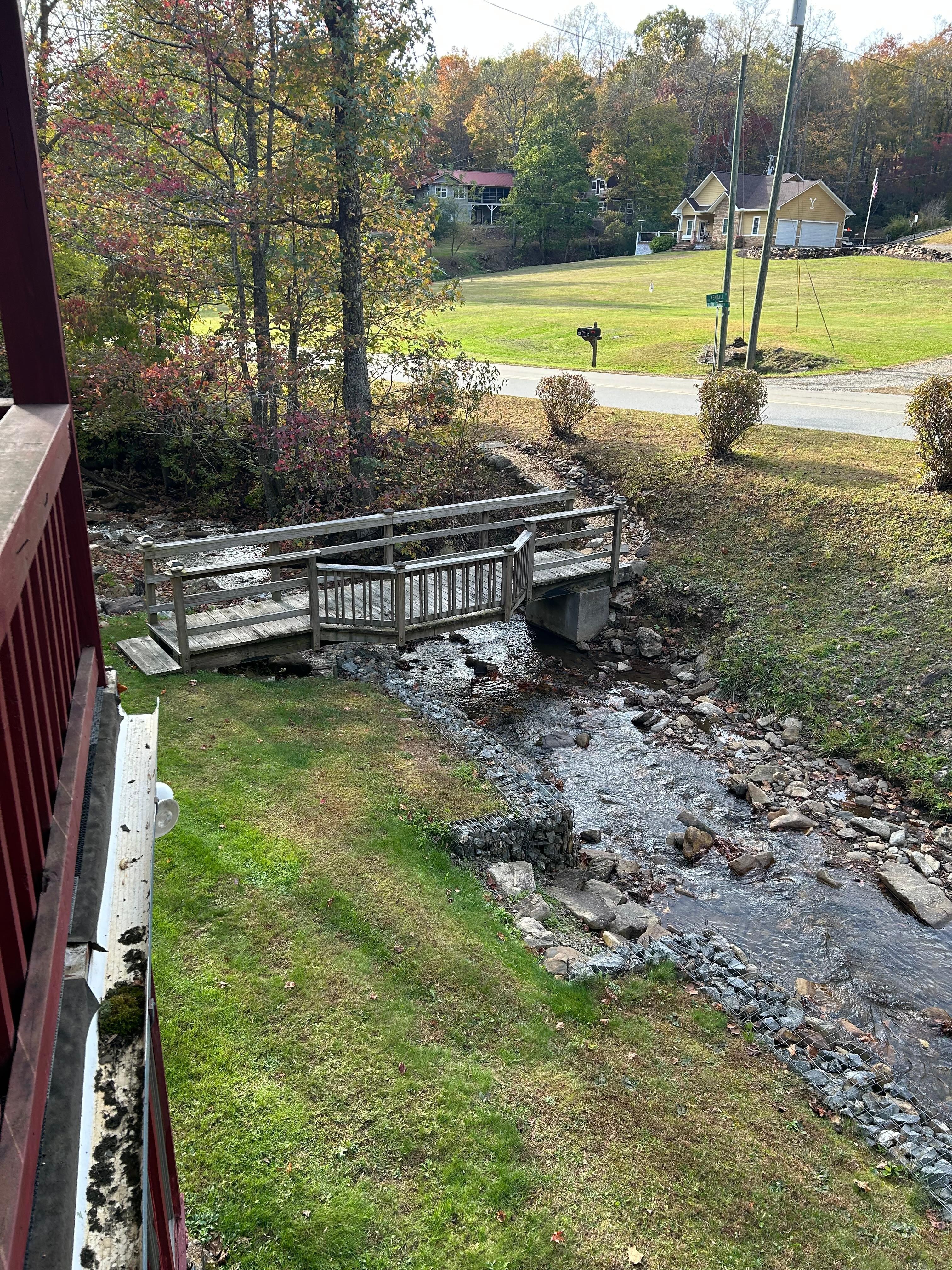 This rustic two-story newly renovated cabin is right on a creek with a covered bridge and water wheel. There is a new mini split system for heating and air conditioning with remote control thermostats. You can sit on the covered porch and listen to the creek or wade in the creek and be splashed by the water wheel. Located just 15 minutes from the Harrah's Valley River Casino or beautiful downtown Murphy and just a short drive to John C. Campbell Folk School. There is a propane grill outside with table and chairs for outside dining and also Adirondack chairs to sit and enjoy the creek. There is a fire pit with wood so you can enjoy a nice fire and roast marshmallows. From the downstairs living area, you can look out the windows and enjoy the view of the creek and water wheel. There is a foosball table, DVD player and movies for rainy days, board games and a smart TV with WIFI. The kitchen has a full-sized refrigerator, stove, microwave, and sink. There are plates, silverware, glasses, coffee pot and coffee cups so you can prepare meals if you wish.