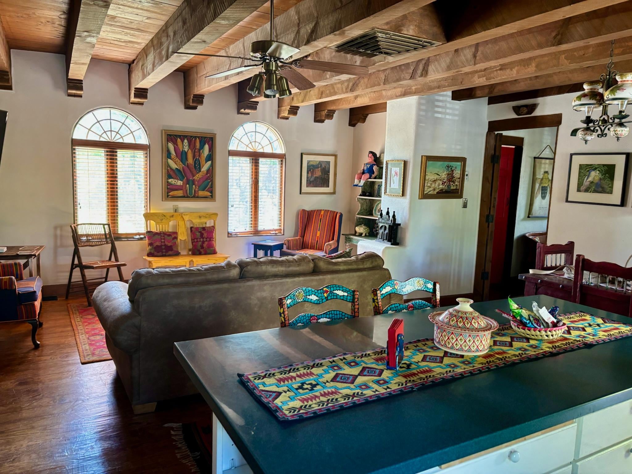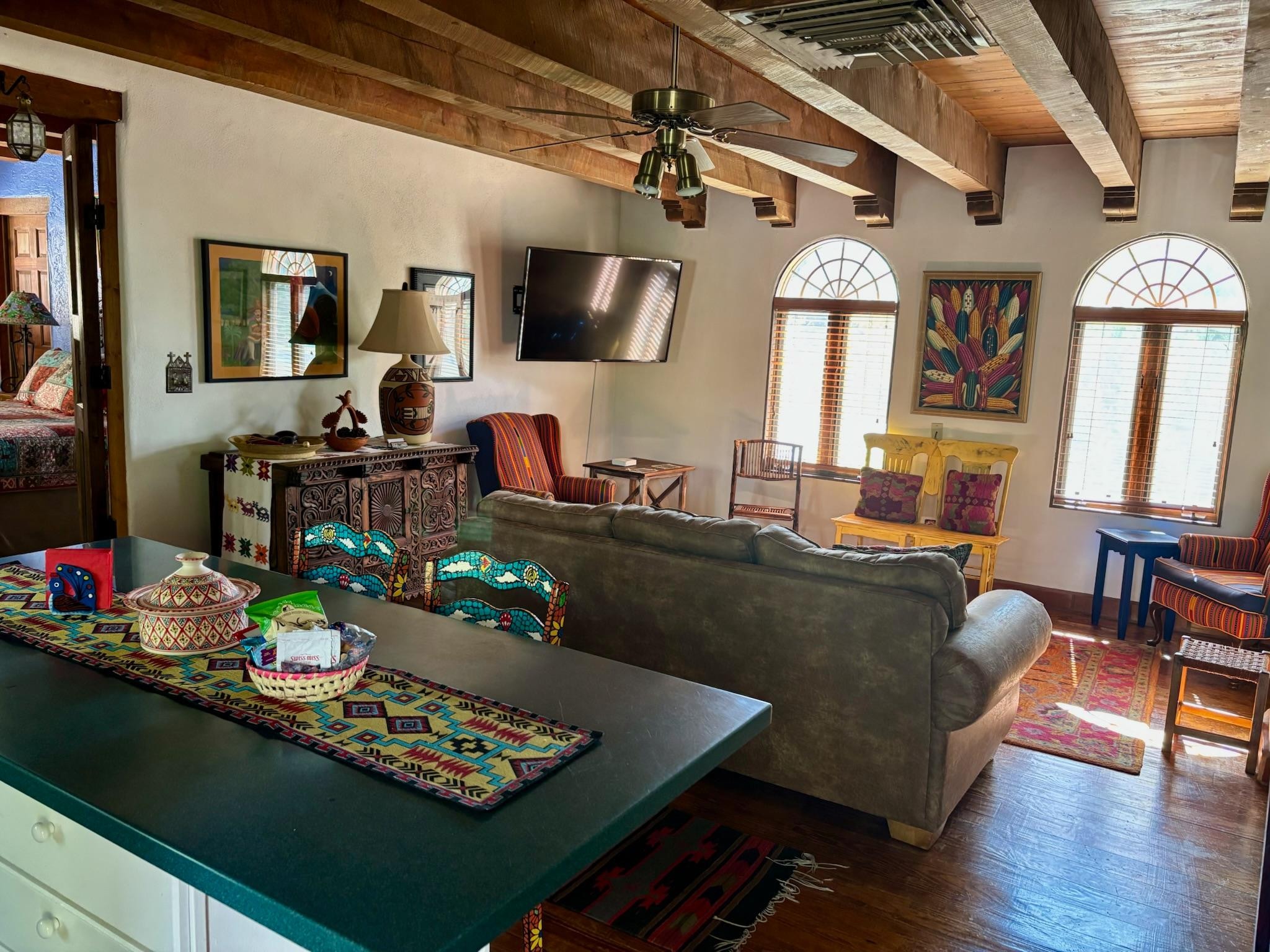 Step into historical elegance with enchanting art and decor at this expansive 2 bedroom, 2 bath home at La Posada de Taos Inn. Every detail has been thoughtfully planned for your stay. Each of the 2 large bedrooms with en suite private baths welcome you to the character and hospitality of Taos. The stocked kitchen and adjoining cheerful dining area are comfortable for gatherings and conversation over cooking anytime of day. Furnishings and art from around the world adorn the Loft collected by the owners in their journeys.