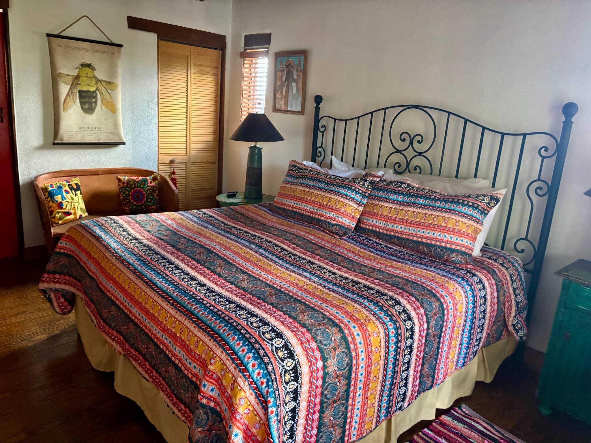 Our Historic adobe home is naturally cool even in the warm temperatures of June here. We do have an evaporative cooling system in the middle living area of the home for additional cooling and it works very well. Our evenings in Taos are definitely cooler but with the added cooling system, almost chilly! Be assured you will have nice, cool evenings with the combination of both.