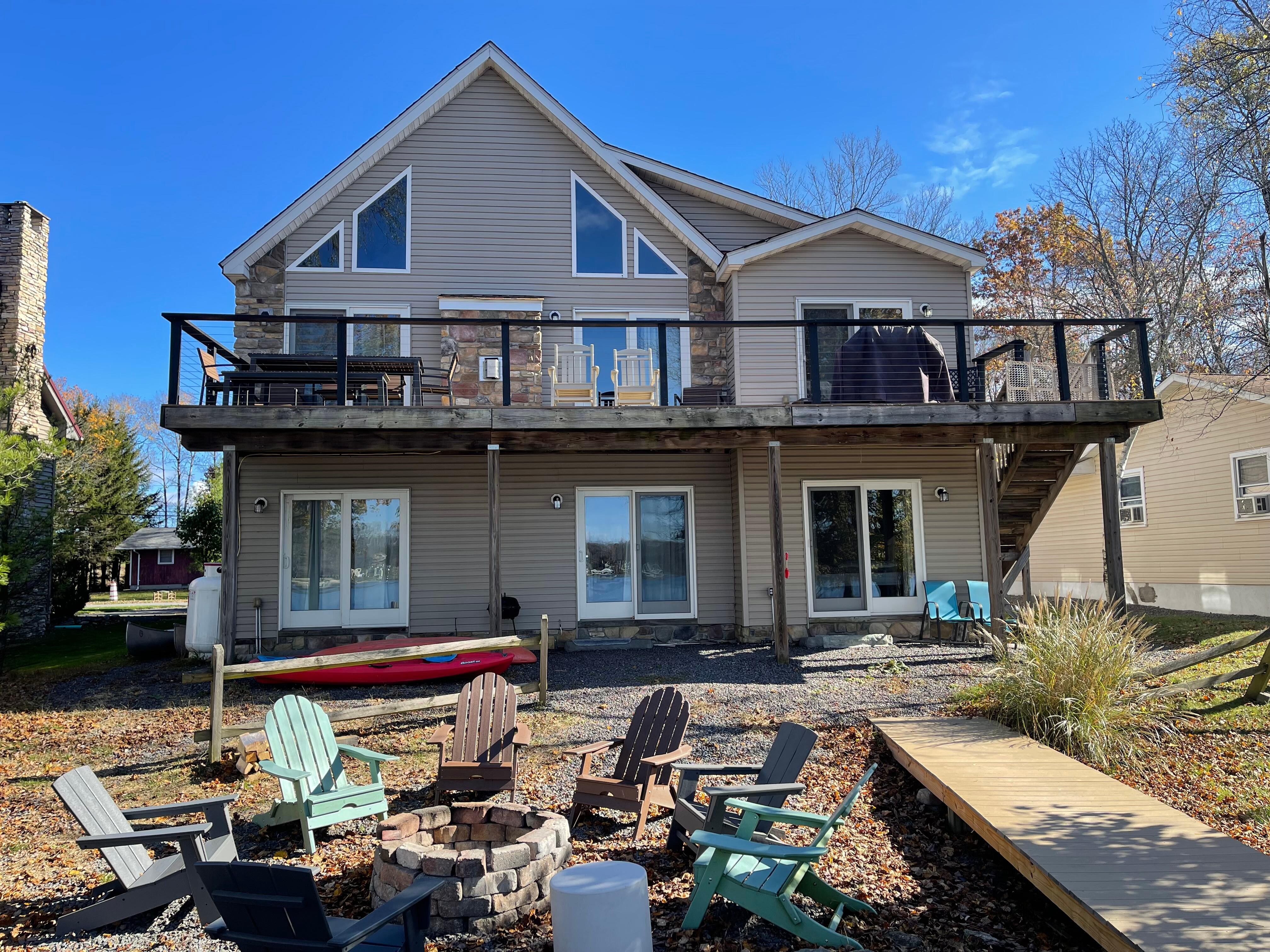 Magnificent waterfront views await at this expansive 5-bed home with many recent updates (new flooring, appliances, furniture, updated bathrooms and pine knoll ceiling). Features a personal boardwalk, sand beach, canoes/kayaks, game room and amazing back yard. Take in the panoramic views from the deck and all common areas, and fish and boat right off of the dock! Arrowhead Lakes is close to Pocono ski resorts and the area features year-round opportunities for skiing, swimming, fishing, kayaking and more.