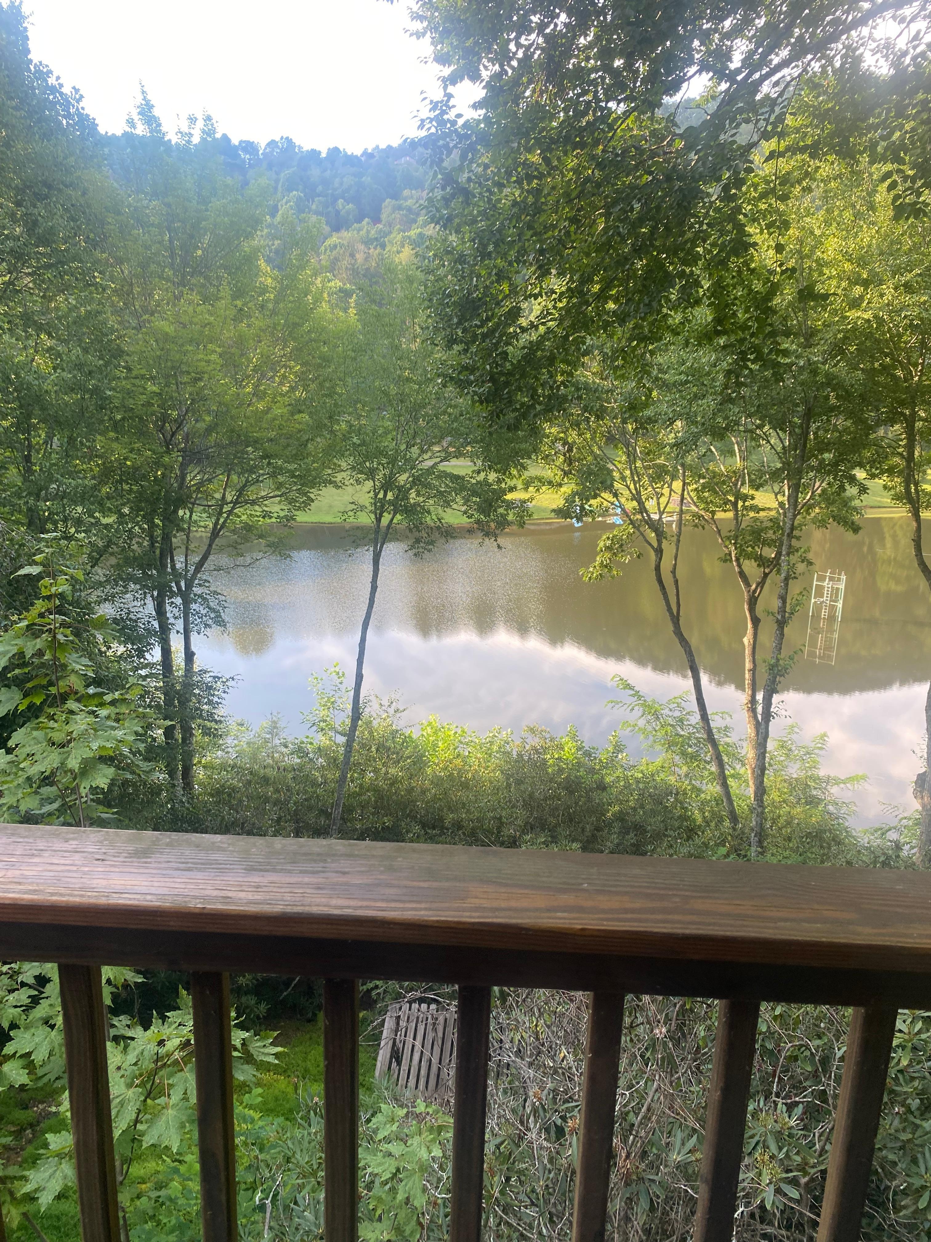 Upstairs is a cozy sitting area with a full-sized futon. The upstairs king bedroom suite has an HDTV and a private ensuite bathroom with a tub and shower. Downstairs features a carpeted game room and den with an HDTV, comfy furniture, and a new slate pool table with a ping pong table topper. One of the den sofas also opens to provide a full sleeper sofa. The big downstairs bedroom has a queen bed, as well as a log twin bed with a twin trundle bed. The downstairs bedroom also has an HDTV and ensuite bathroom with a shower. There is a laundry room downstairs as well, and the rear deck offers a hot tub, looks down at the lake, and out at mountain views.