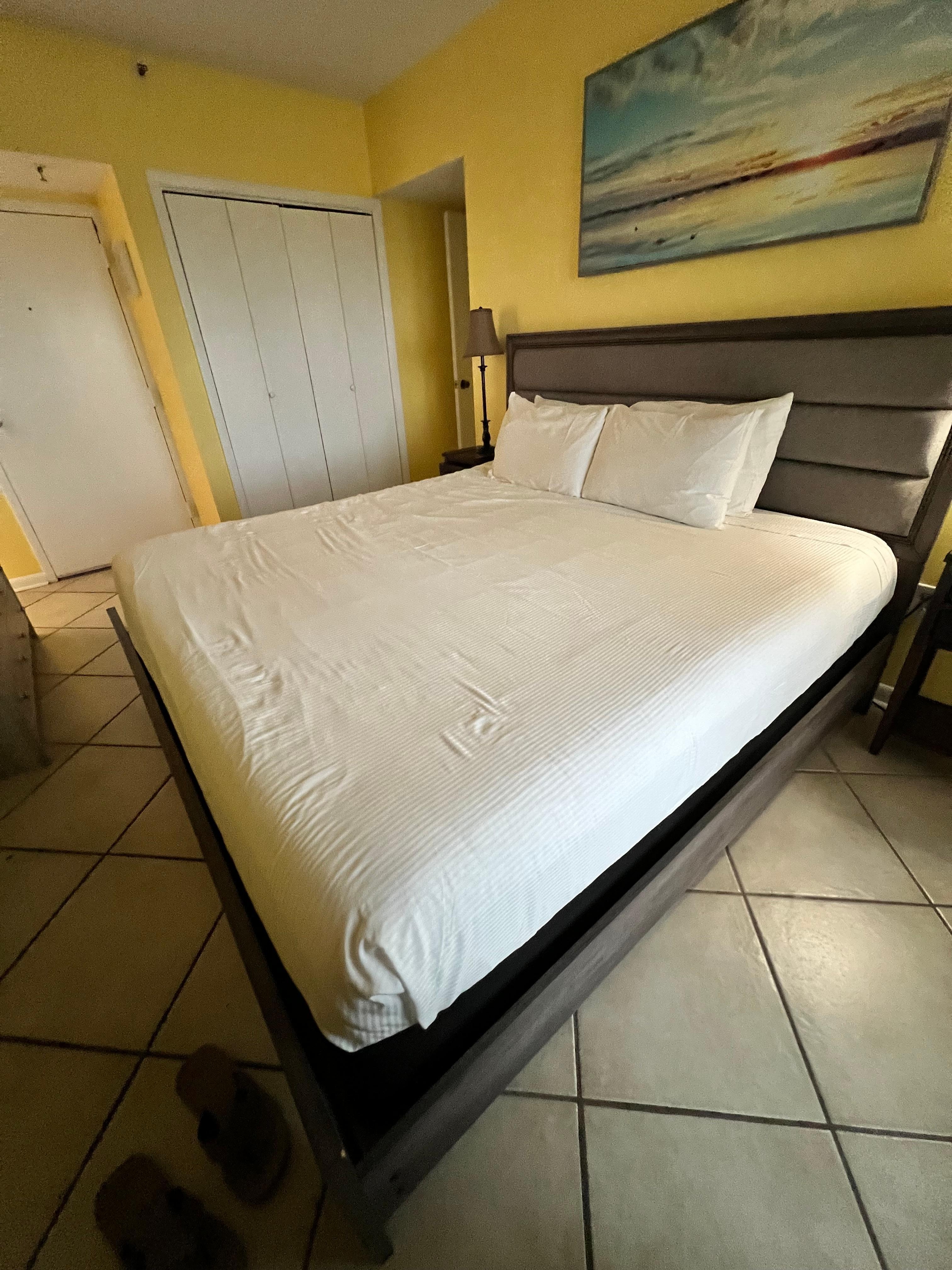 As you walk into the condo, the primary bedroom suite is to the right and the dining area is to the left. The primary bedroom suite has a balcony access, a TV, and an attached bathroom.