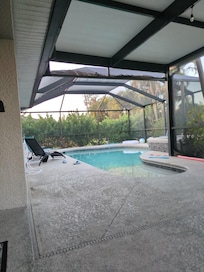 Pool home with 1400 square feet and 3 bedrooms / 2 bath with heated saltwater pool and spa in a quiet neighborhood in Cape Coral