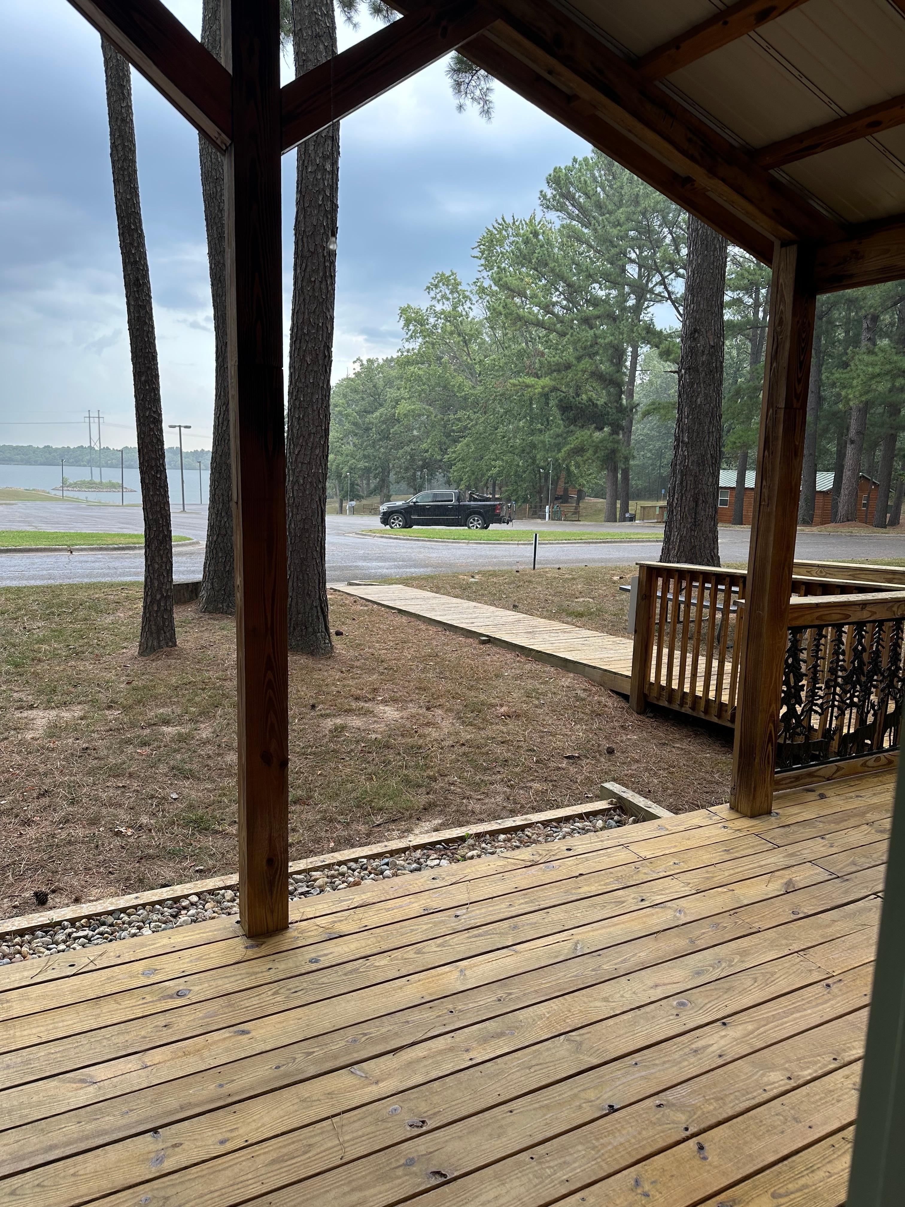 The Pines is a two bedroom, one bath, open living, dining and full kitchen area. As with Buck & Bass Cabins, there are various sleeping configurations. All beds are adult length beds, even the THREE LEVEL Twin XL bunks. The king bed can be configured to make two Twin XL beds if you desire. The living area couch makes out into a comfortable queen size bed. All sheets, plates, glasses and cooking utensils are included. The Pines is the largest of the three cabins. The interior finishes are very nice with a rustic flair. To view the type of interior finishes used view the listings for Buck Cabin and Bass Cabin. The exterior is log siding and green metal roofing. The cabin itself is the largest of the cabins to date at 660 square feet. The deck is also the largest to date. In addition to the covered front deck there are two sun decks totaling almost 400 square feet of deck. Again as with the others there is an outside fire pit, picnic table and swing.