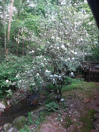 THE FOREST. The cabin is located amongst a forest of tall trees and is heavily shaded creekside. Many of the trees are 50 feet tall or more. We have lots of rhodos and azaleas blooming from May on. So even in the winter there will be the green of the rhodos all around you. The creekside is usually cool. Because of the creek and our elevation (about 1500 feet) it’s always cooler here - even in summer.