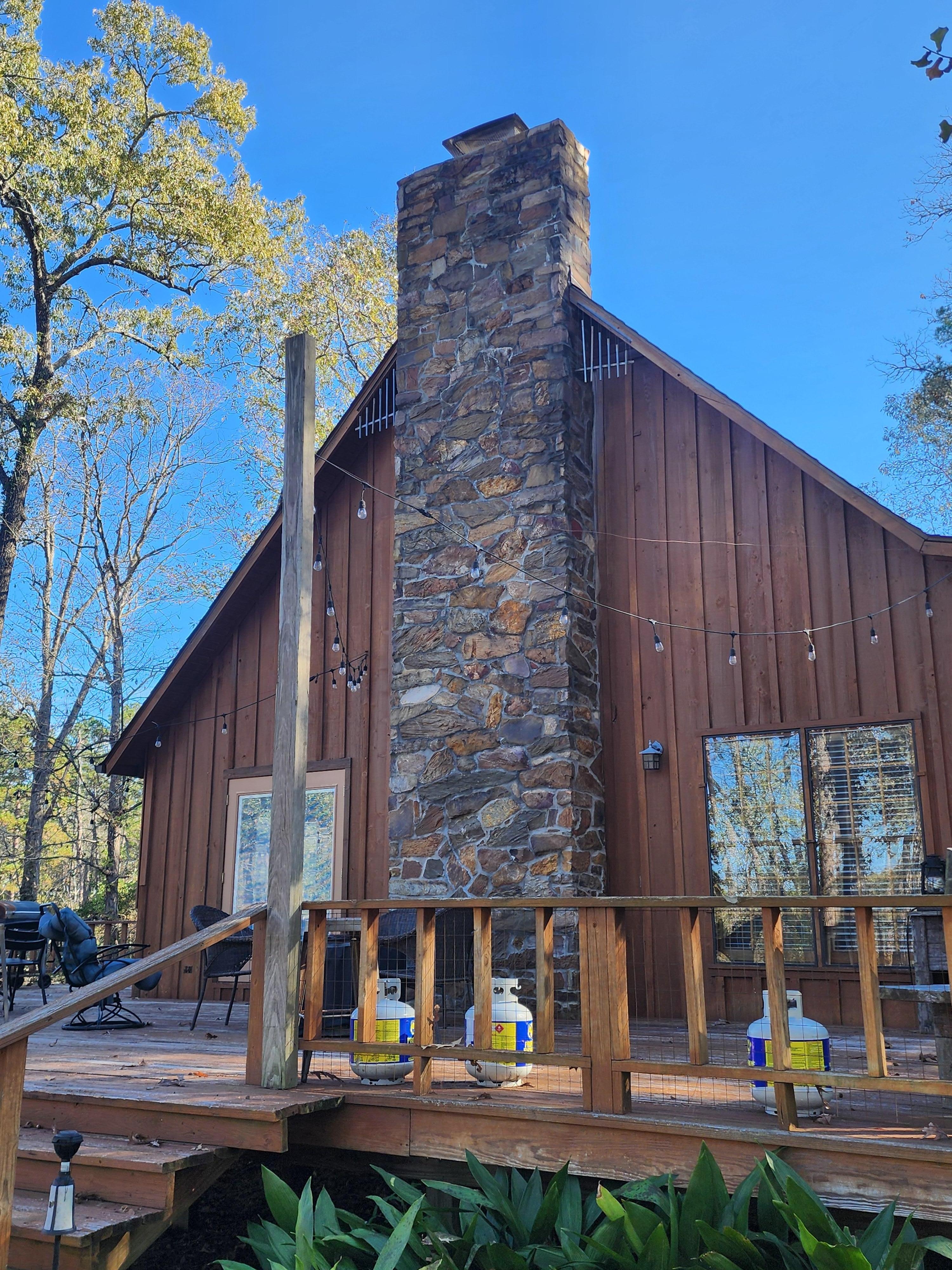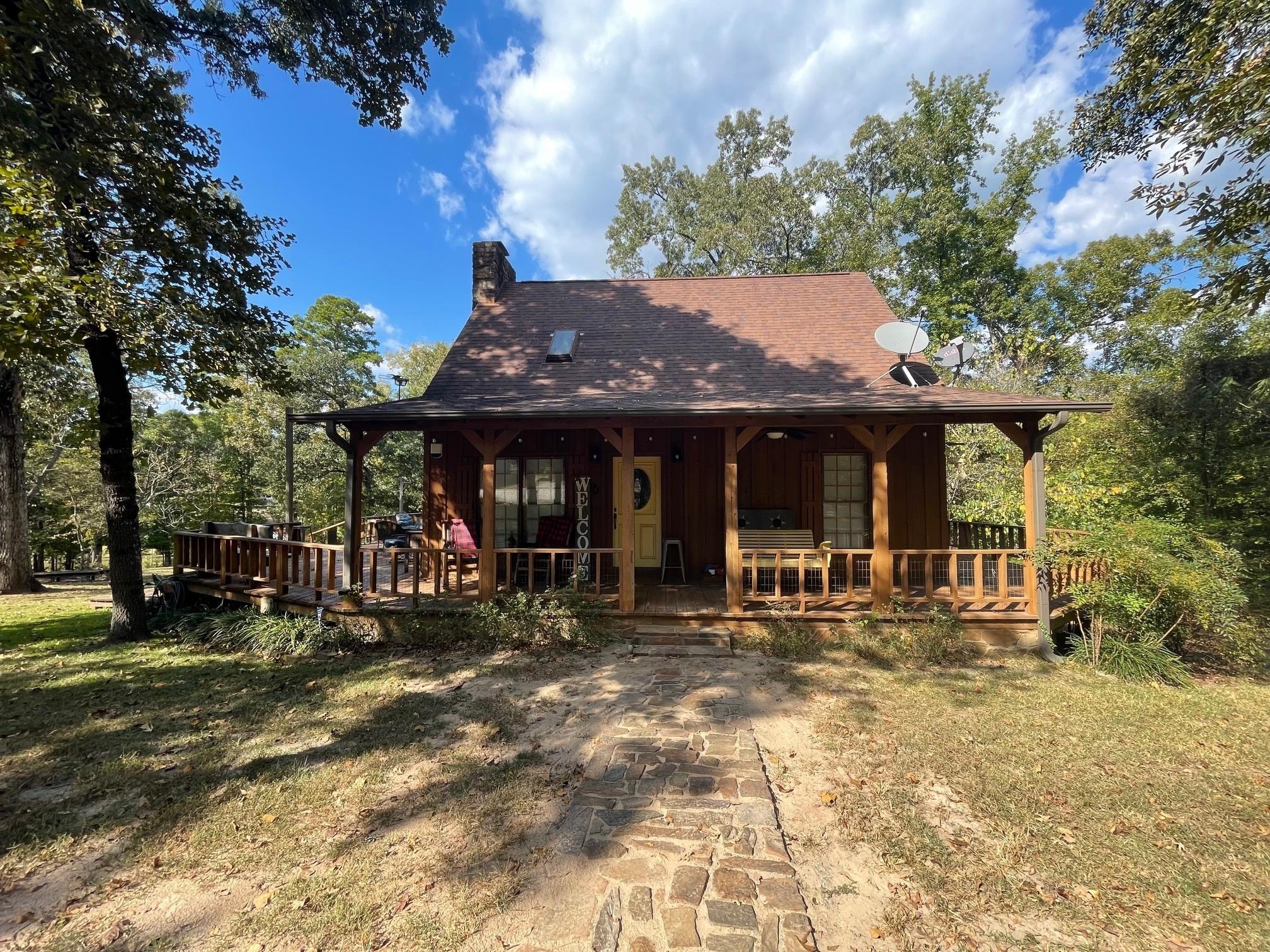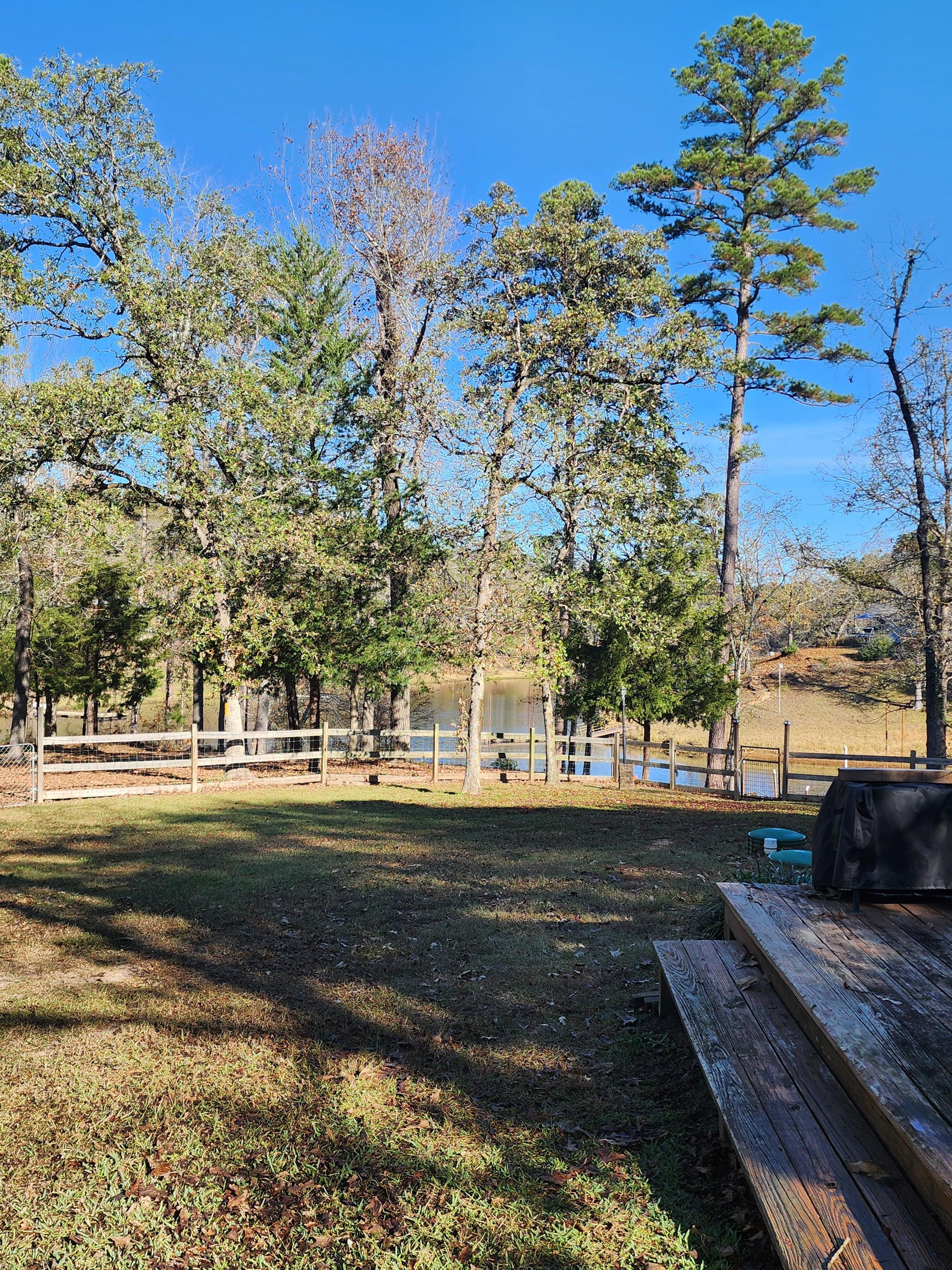 Two story cabin located on a point with water on two sides. It is located in a quiet area of the lake near Big Cypress Marina and Longview Yacht Club. The house sits on an acre of land with plenty of trees and privacy. Entire yard is fenced for pets. The house has large walk around deck, central A/C, open floor plan, comfortable living area with fireplace, 1 bedroom and bath downstairs and 1 bedroom and bath upstairs. The stairs have an above average rise, typical is 7"-8", it is 8 1/2" with the first step being 9 1/2". It has a fully stocked kitchen with washer and dryer. The dining table seats 6 and 2 at the bar. The detached garage sleeps 4 equipped with its own refrigerator, stove, electric fireplace and projector. The deck wraps around the entire house with seating and fire pit. The large yard also has a fire pit with beautiful view of the lake. The dock is on the cove side and is great for fishing. The woods on the east side of the house are great for spotting deer. Wonderful place to relax, fish, enjoy family or play games ( indoor and out).