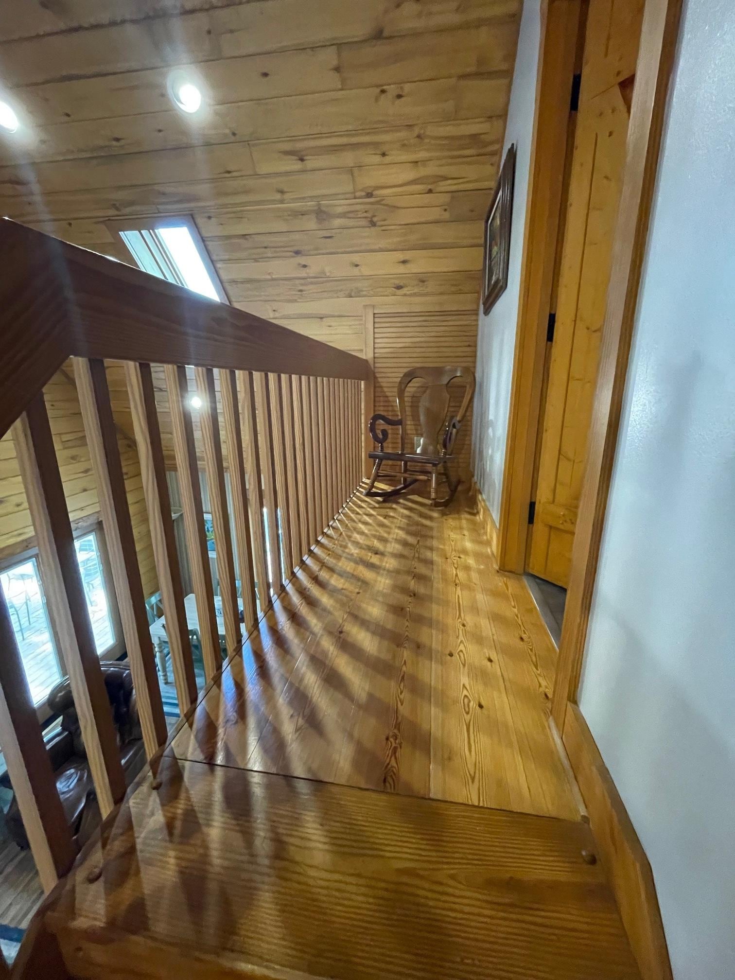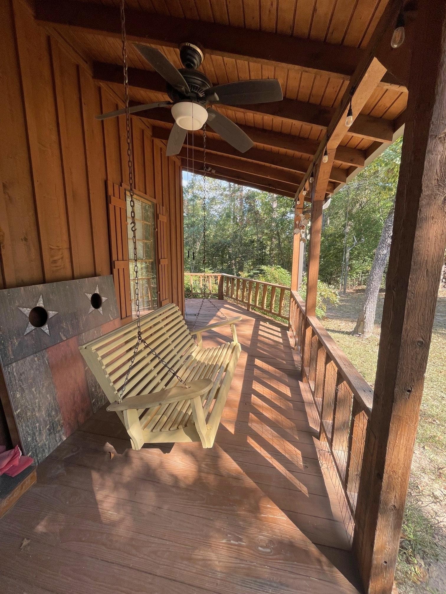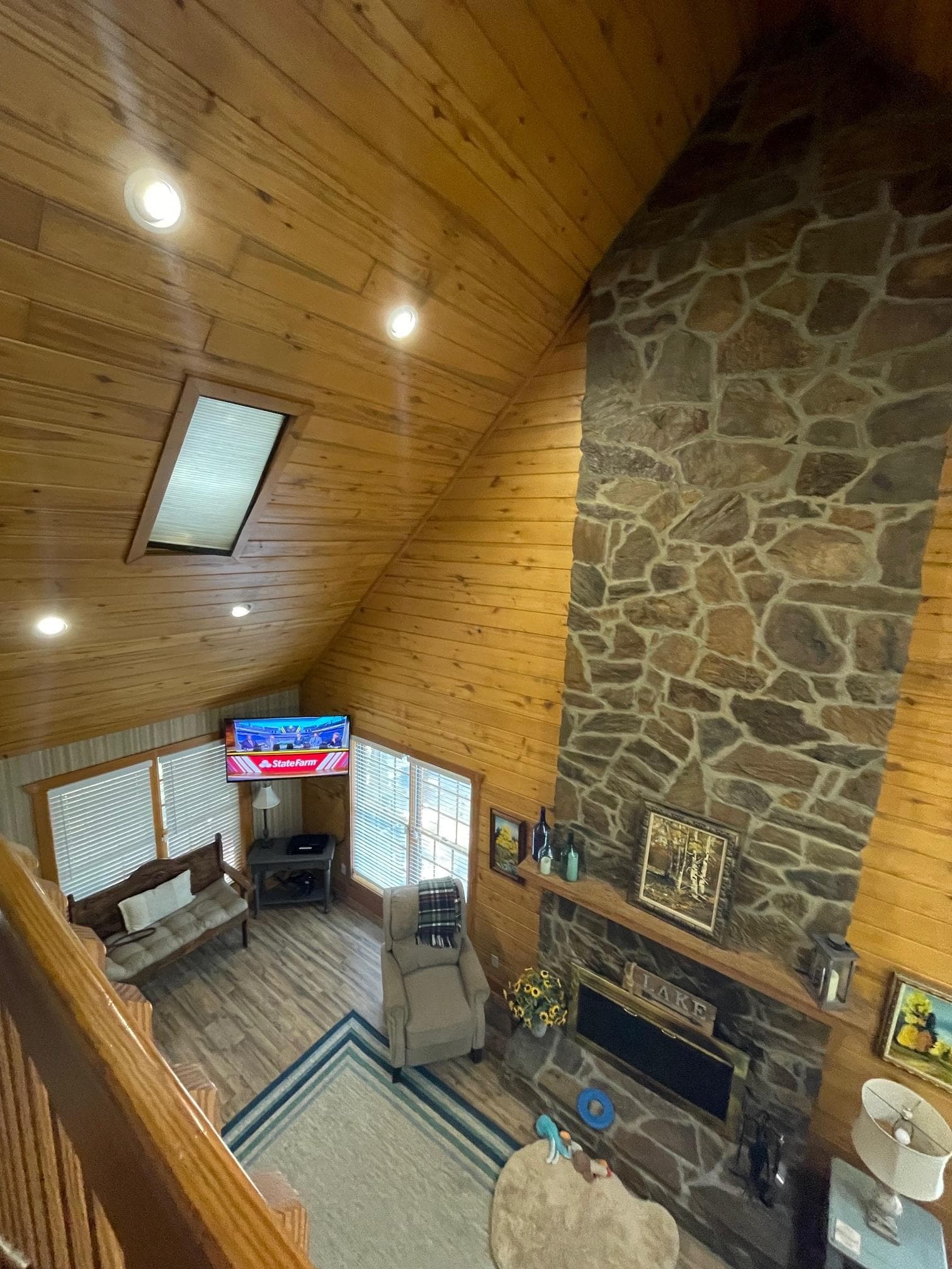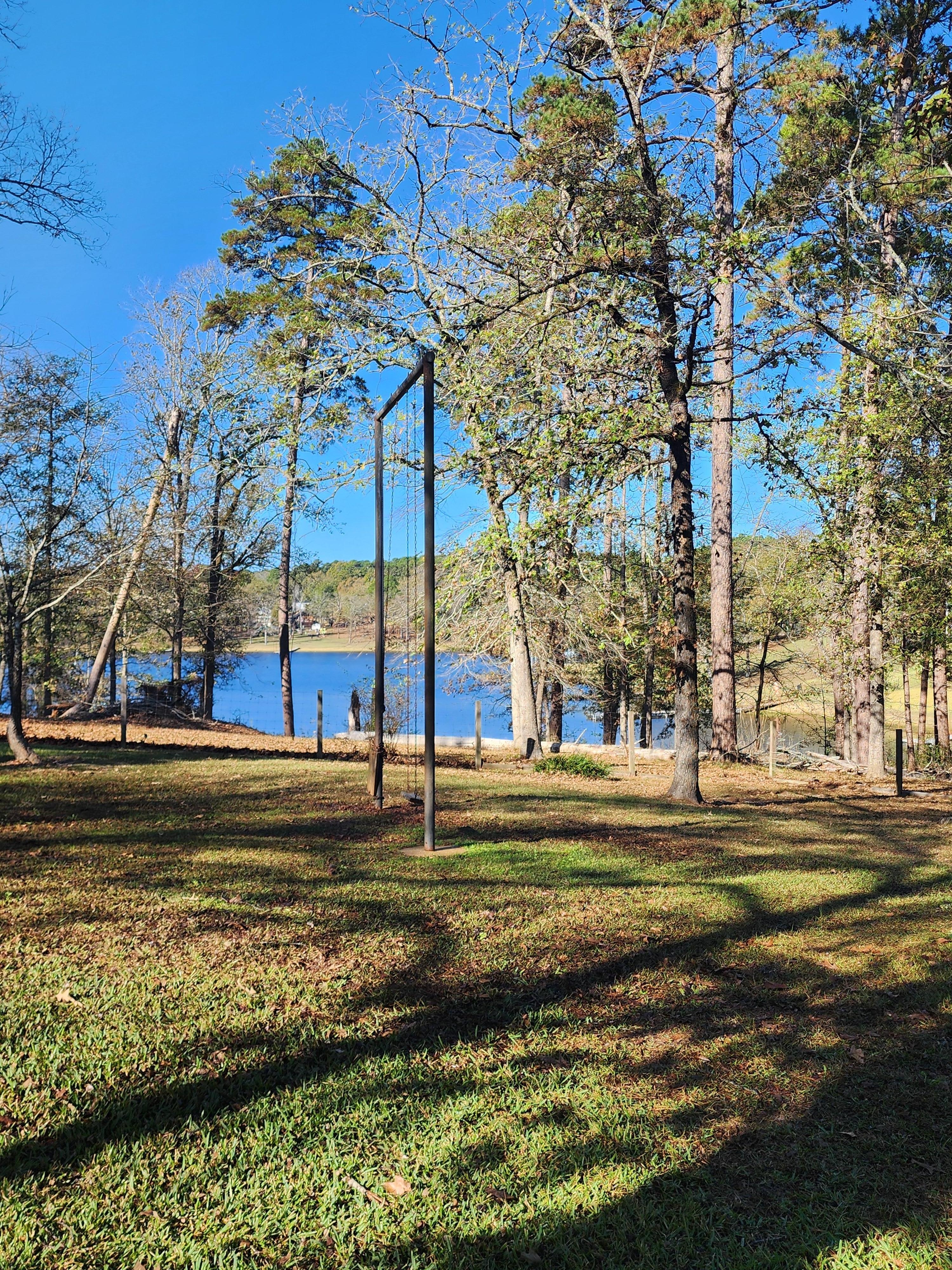 Two story cabin located on a point with water on two sides. It is located in a quiet area of the lake near Big Cypress Marina and Longview Yacht Club. The house sits on an acre of land with plenty of trees and privacy. Entire yard is fenced for pets. The house has large walk around deck, central A/C, open floor plan, comfortable living area with fireplace, 1 bedroom and bath downstairs and 1 bedroom and bath upstairs. The stairs have an above average rise, typical is 7"-8", it is 8 1/2" with the first step being 9 1/2". It has a fully stocked kitchen with washer and dryer. The dining table seats 6 and 2 at the bar. The detached garage sleeps 4 equipped with its own refrigerator, stove, electric fireplace and projector. The deck wraps around the entire house with seating and fire pit. The large yard also has a fire pit with beautiful view of the lake. The dock is on the cove side and is great for fishing. The woods on the east side of the house are great for spotting deer. Wonderful place to relax, fish, enjoy family or play games ( indoor and out).