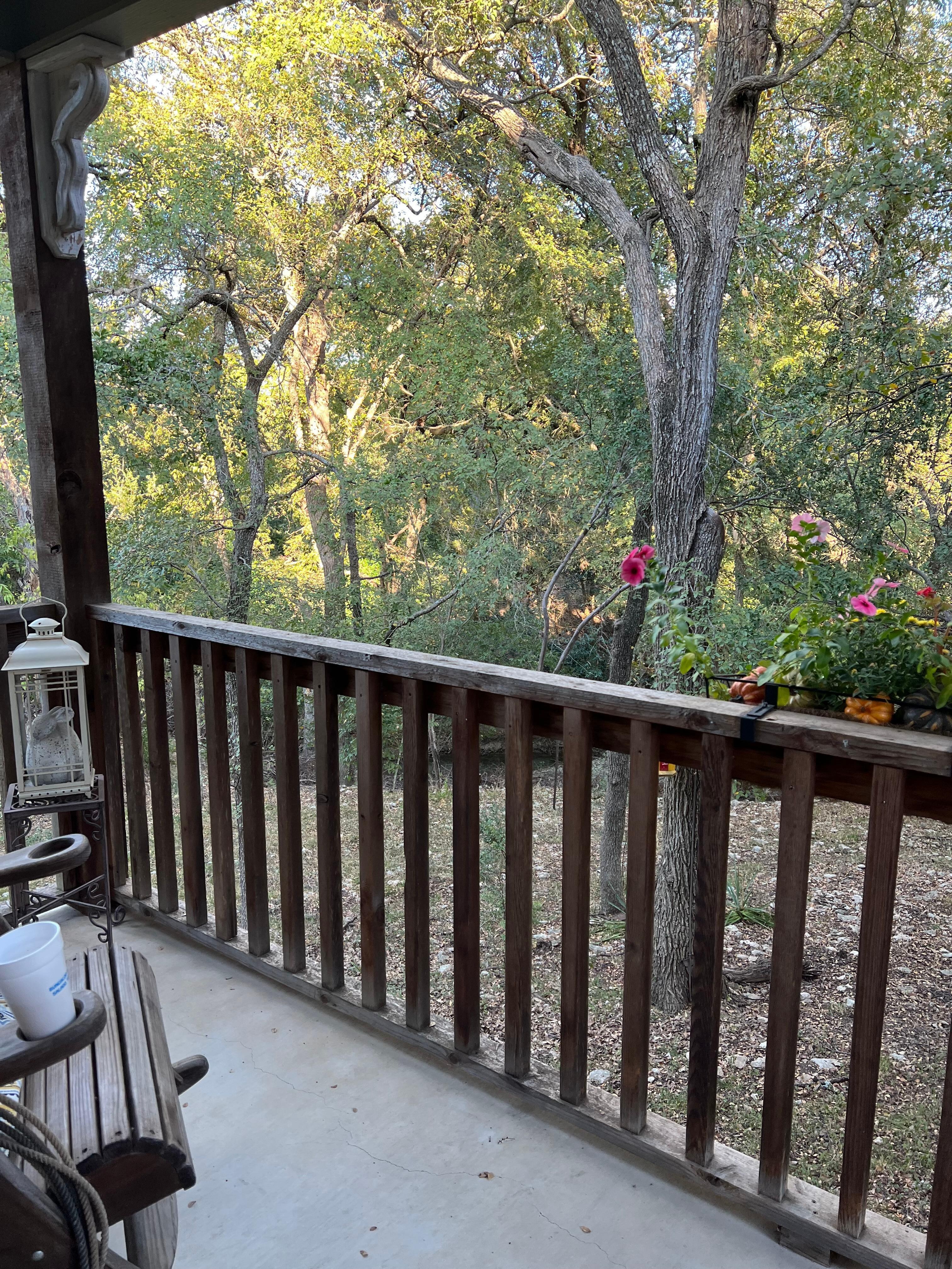 Built in 2018 as a “guest house/dream come true” next to our main residence. We are located at 335 College Hill Drive one block from Main Street. Short walks to restaurants, a popular creekside microbrewery and convenient to shops and local eateries. Our Bungalow Oaks has an attached carport, and the main room has a king-size bed next to a massive antique armoire. A separate bathroom with a walk-in shower and antique vanity has all the privacy of home. The coffee bar has a small refrigerator, an ice maker, a pod-type coffee maker and a microwave. For morning and evening relaxation there are two oversized rockers on the back porch for bird watching and deer viewing along the dry creek below.