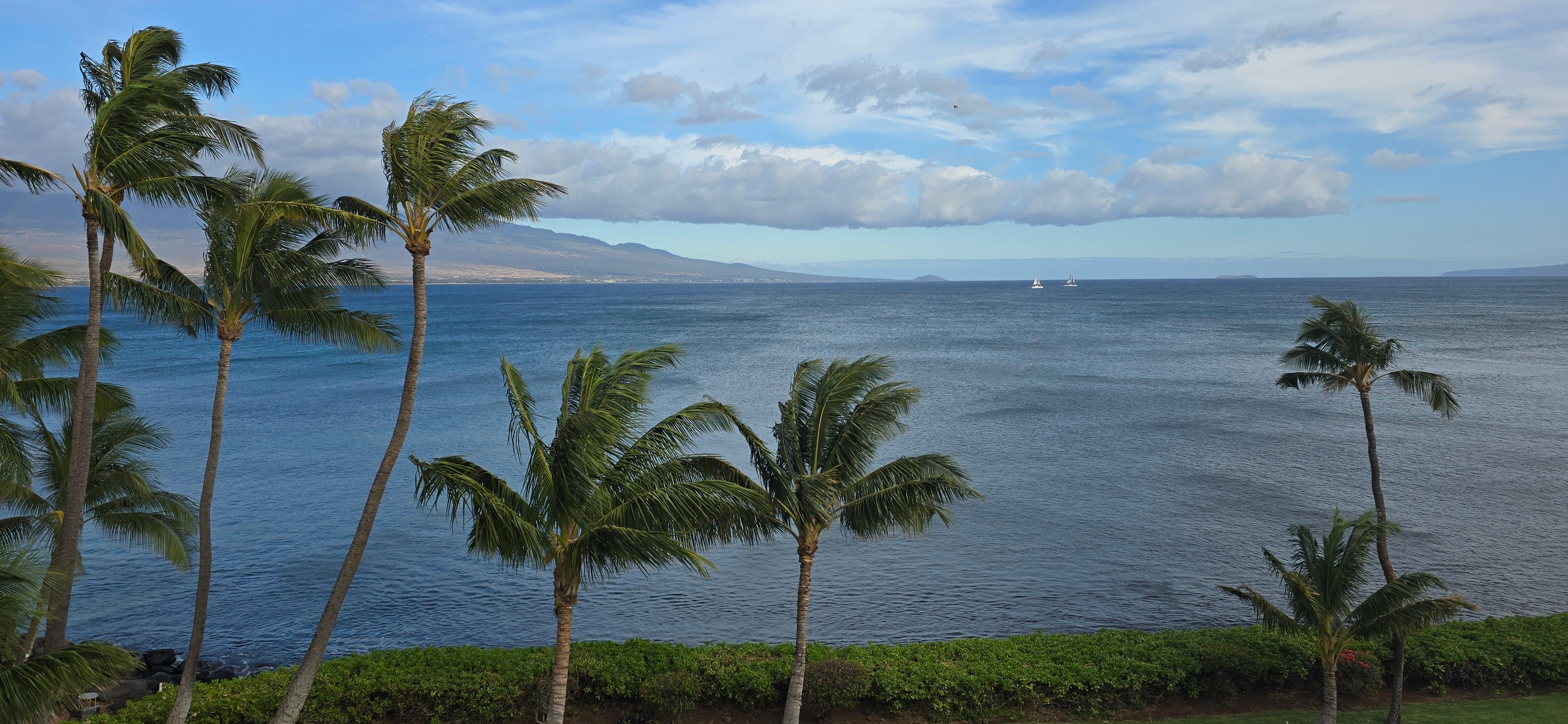 Maalaea Banyans #403 is a 2 bedroom, 2 bath unit on the top floor. It has a panoramic ocean view, a fully-equipped kitchen, window unit air conditioning in the living room and master bedroom, 3 flat-screen TVs, and free WIFI. The living room features A/C, ceiling fan, and flat-screen TV. A pair of high-powered binoculars is included for spotting turtles and whales. There is a king bed in the master bedroom, A/C, ceiling fan, a flat-screen TV, and a full bathroom. Bedroom #2 has a queen bed, ceiling fan, flat-screen TV, and a full bathroom. Bedroom #2 is above the living room and is sufficiently cooled by the living room A/C. In addition to the listed amenities, #403 also has a vacuum cleaner, Circulon cookware, a spice rack, Kitchenaid knife block, and Kitchenaid hand mixer, a set of mixing bowls, BBQ tools, a waterproof rechargeable Bluetooth speaker, and a Sharper Image 6-port USB charging station. Note: A $300 refundable security deposit is required for this unit. Sleeps 4.