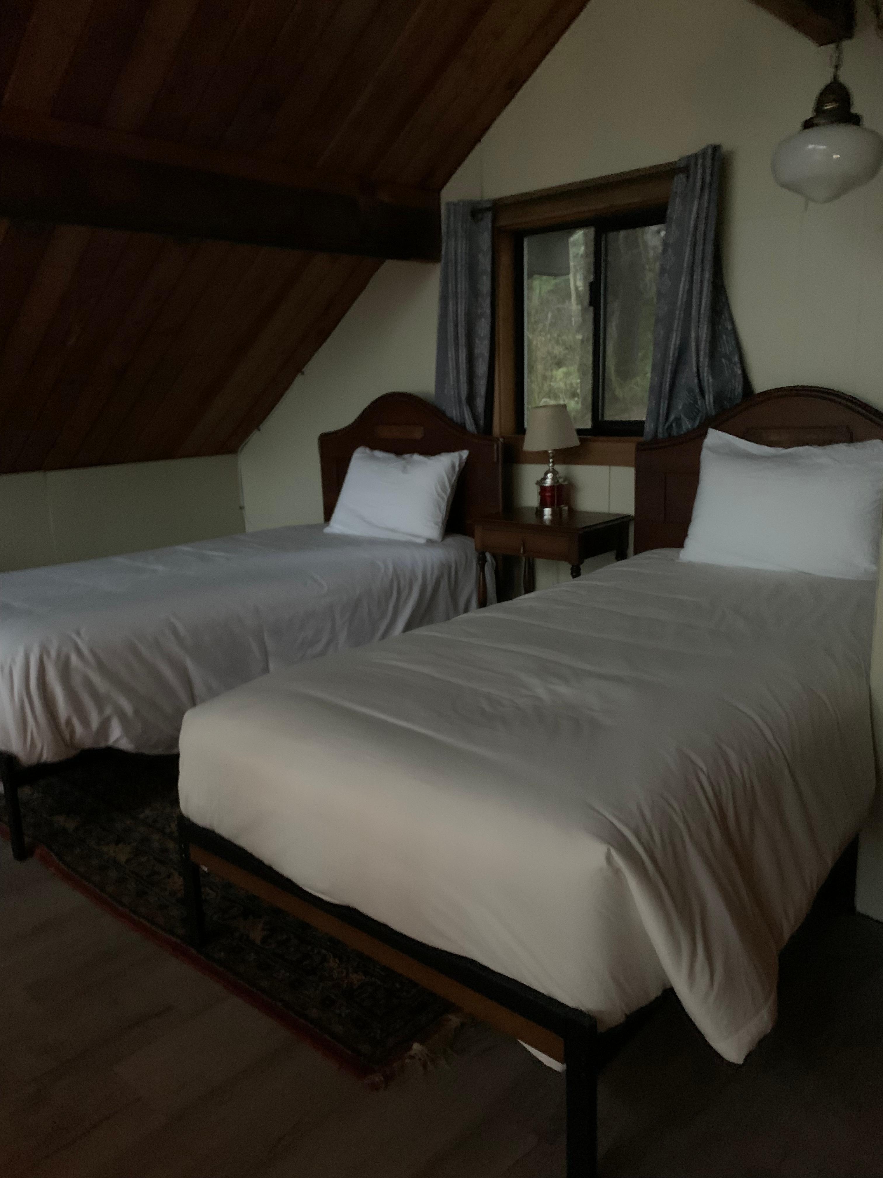 The cabin itself is rustic in decor, with a wood-burning fireplace. Electric heat is also available to ensure your comfort. The downstairs bedroom has a king bed. A ladder with a handrail takes you to the loft area, which offers two twin beds. The ladder has a 300 lb. weight limit.
