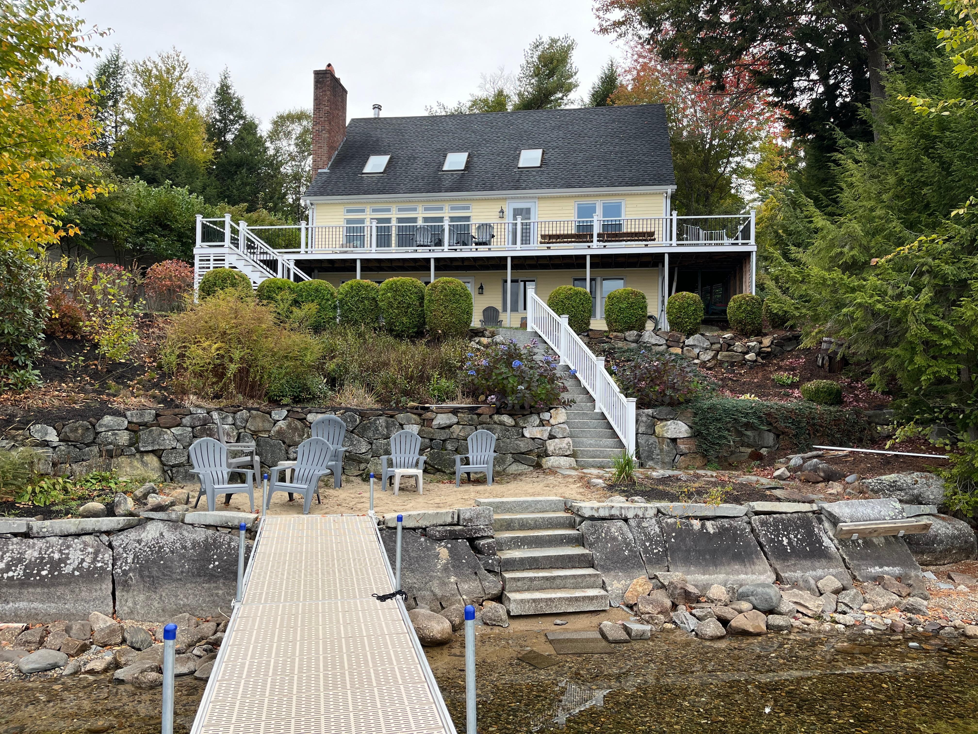 You will just love this wonderfully spacious, Lake Winnisquam Contemporary Cape with breathtaking lake views and spectacular sunrises! What better way to greet the morning than sipping coffee on the deck overlooking the lake while listening to the occasional loon from the nearby Loon Sanctuary. Lakefront amenities include 75' of water frontage, perched sandy beach and 40' private dock (new dock installed 2023). Excellent for large families and groups. Open concept main floor and bright kitchen, large dining area and vaulted living room with a wall of windows and door opening onto the wrap around deck (new deck installed 2023) capturing the gorgeous lake views! Main floor Master (King bed) with views and master bathroom. Also on the main floor is another full bath. Upstairs offers three more bedrooms (King, Queen and room with 2 full beds and a twin with an extra twin mattress available to use elsewhere in house), a full bath, and loft area. The walk out lower level features a rec/family room with pool table, sliders to patio overlooking yard and lake and the 5th bedroom (Queen) with lake views. New washer and dryer (2021) in basement. King mattresses are brand new, May of 2025. All other mattresses replaced in 2021.