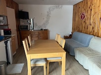Located at Le Lioran station, furnished apartment for 6 people with a living area, kitchen, balcony with view on the piste. Equipped with a sofa bed (2 pers), 2 fireside chairs, 2 bunk beds.
