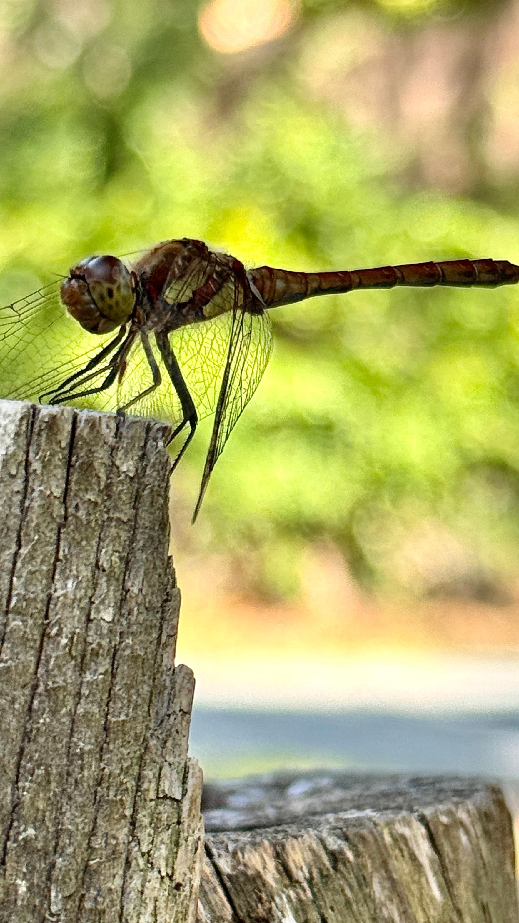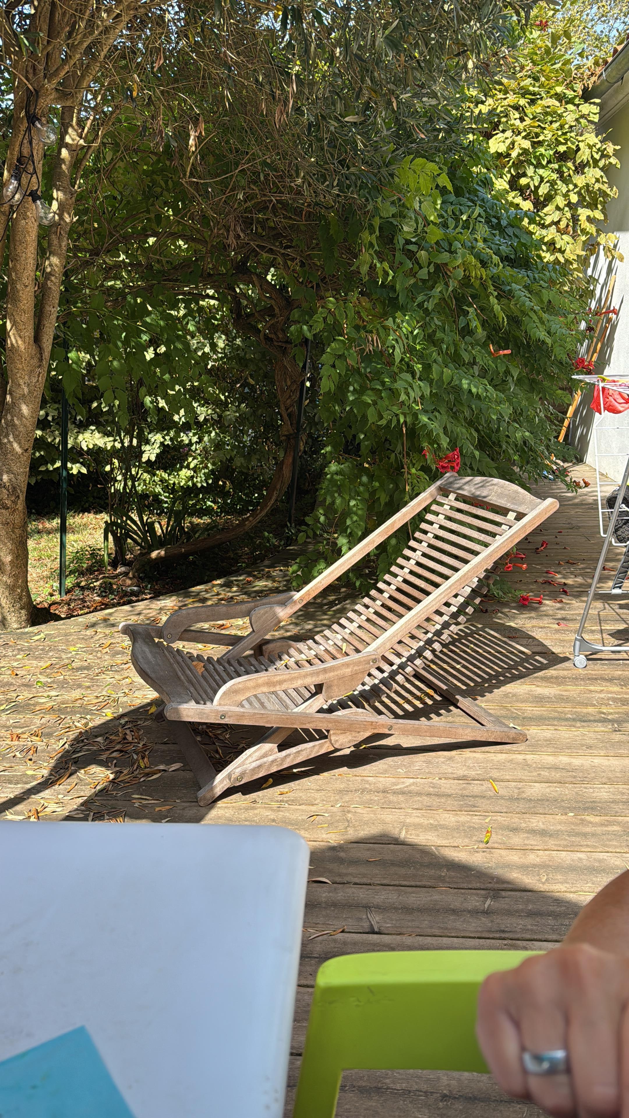 1 wooden terrace with table and 6 chairs, a beach umbrella, two recliner chair.