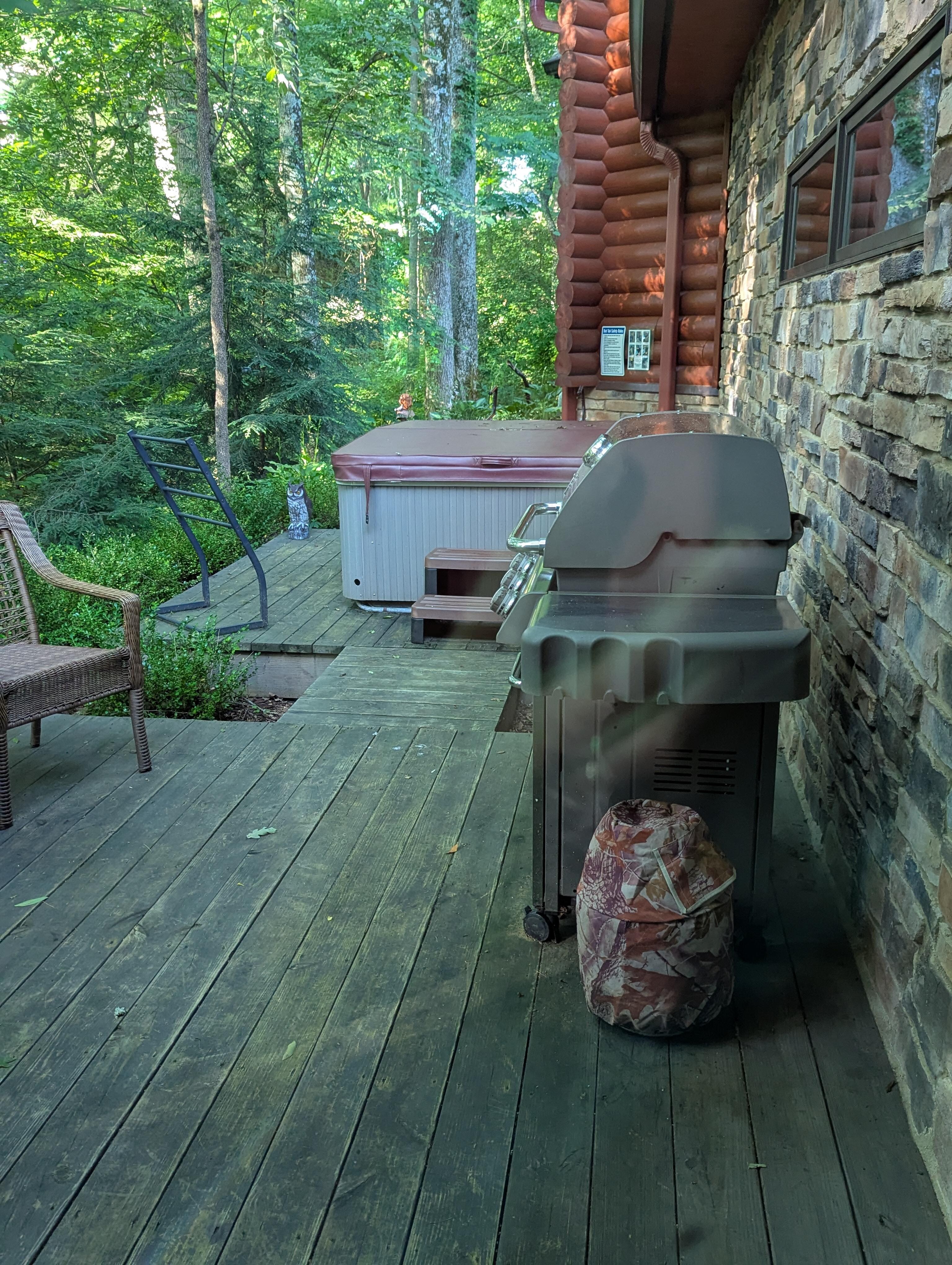 The deck overlooking the beautiful gardens and the ravine is just outside the great room through the sliding glass door. The gardens surrounding the suite are a delight. Relax on a cool evening with a fire in the privacy of your own space. Throw a steak on the gas grill and open a bottle of wine for an easy dinner at home. The suite has it's own hot tub on the adjoining deck, completely private for only you. Slide into the warm and bubbly water for your relaxing pleasure.
