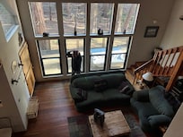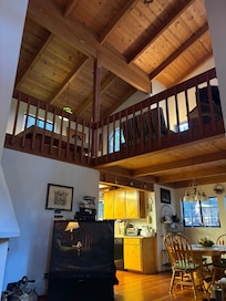 This cabin is beautiful with vaulted ceilings and hardwood floors. It is fun to snuggle and relax in front of the fire place and watch the snow fall outside.