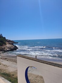 Unbelievable apartment in Sitges in front of the sea. 10 meters to the beach. 2 double bedroom, one of them (the main one) with a sliding door which you may leave it opened during the day in order to get a wider living room, plenty of sunlight and beautiful view to the sea. 1 bathroom with bathtub. Living room with sea view. Parquet floor. 30 m2 private garden. 15 m2 backyard. A/A. TV. Wi-Fi. Kitchen with dishwasher. Washing machine. Fridge and freezer. Oven and Microwave oven.