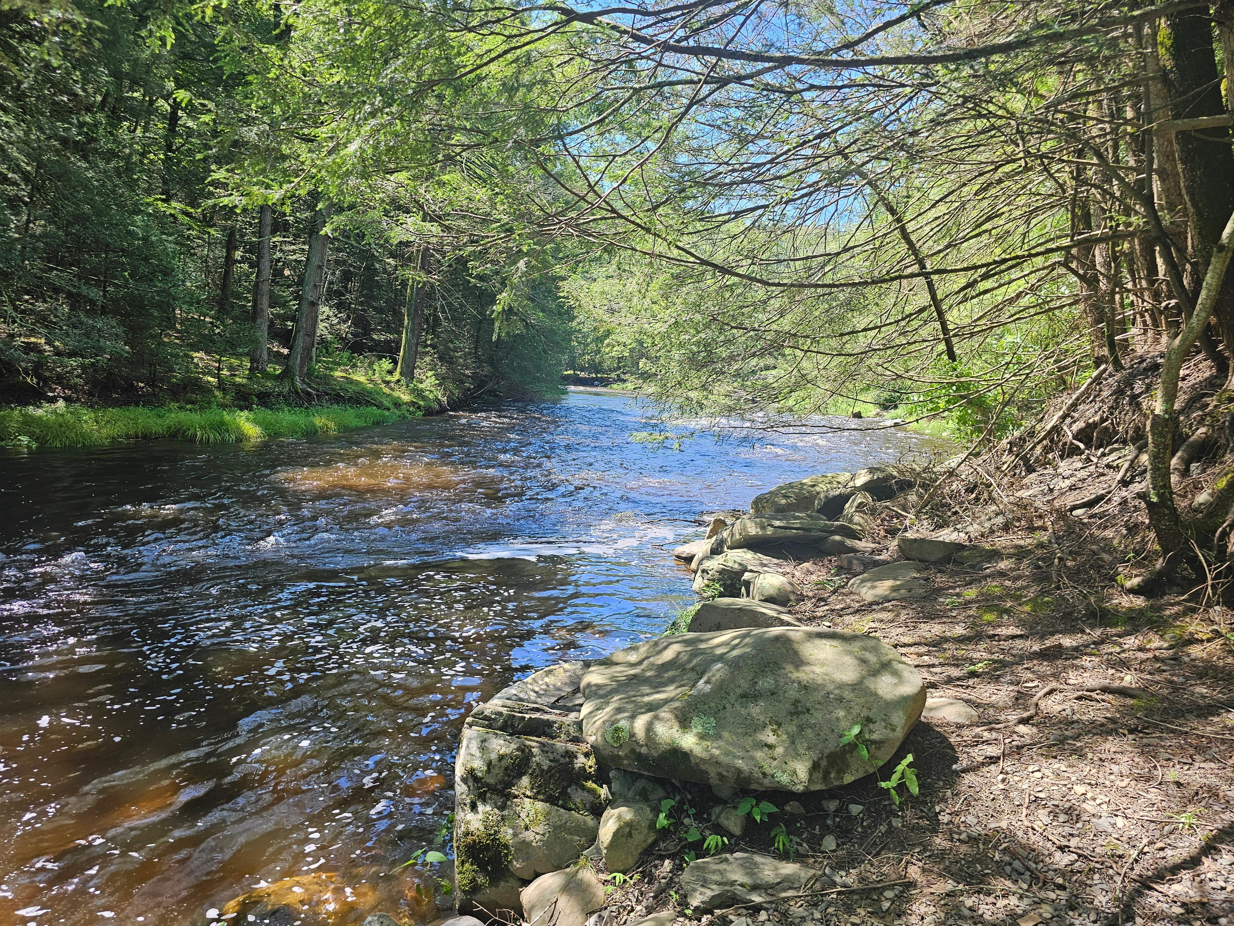 Cozy Waterfront Log Cabin with property right on the Bushkill Creek. Escape the hustle & bustle of everyday life and unplug from technology by embarking on a peaceful vacation getaway in this charming log cabin on a private road. This spacious cabin sleeps 9 in 2 bedrooms (1 queen bed, 1 twin over full bunk) and 1 large loft (1 queen and 2 single beds). Maximum 8 adults allowed. The great room includes a wood fireplace and dining area with seating for 7 (add'l folding chairs available in the shed.) The fully stocked (newly renovated in 2024) kitchen includes a microwave, electric range, full size refrigerator, drinking water dispenser, and full coffee bar (drip and espresso machines, coffee grinder.) There is a large screened porch with a sitting area to enjoy watching the deer drink at the creek and a picnic table to enjoy meals in warm weather. There is also an outdoor fire pit for making S'mores and a Weber grill to enjoy some steak. Enjoy swimming, tubing, great trout fishing, reading, or any of the nearby Poconos attractions.