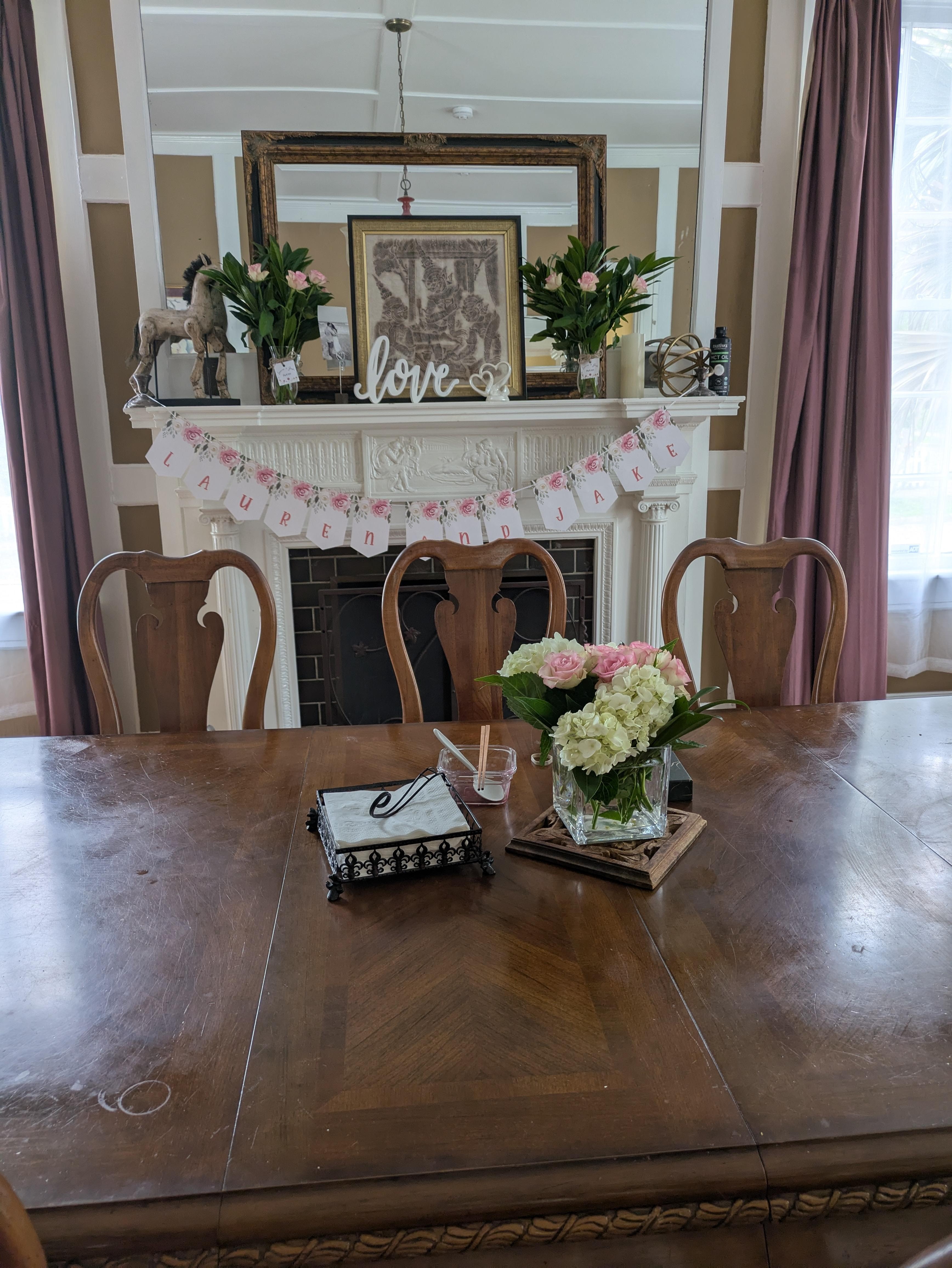 Our guests tell us that they love the chef’s kitchen with its stainless steel countertops and three sinks. Cooking for a large group is a pleasure in this well equipped and spacious kitchen. There is seating for 6 around the kitchen island for informal meals. The formal dining room seats 10-12 people comfortably for formal meals and holiday dinners.