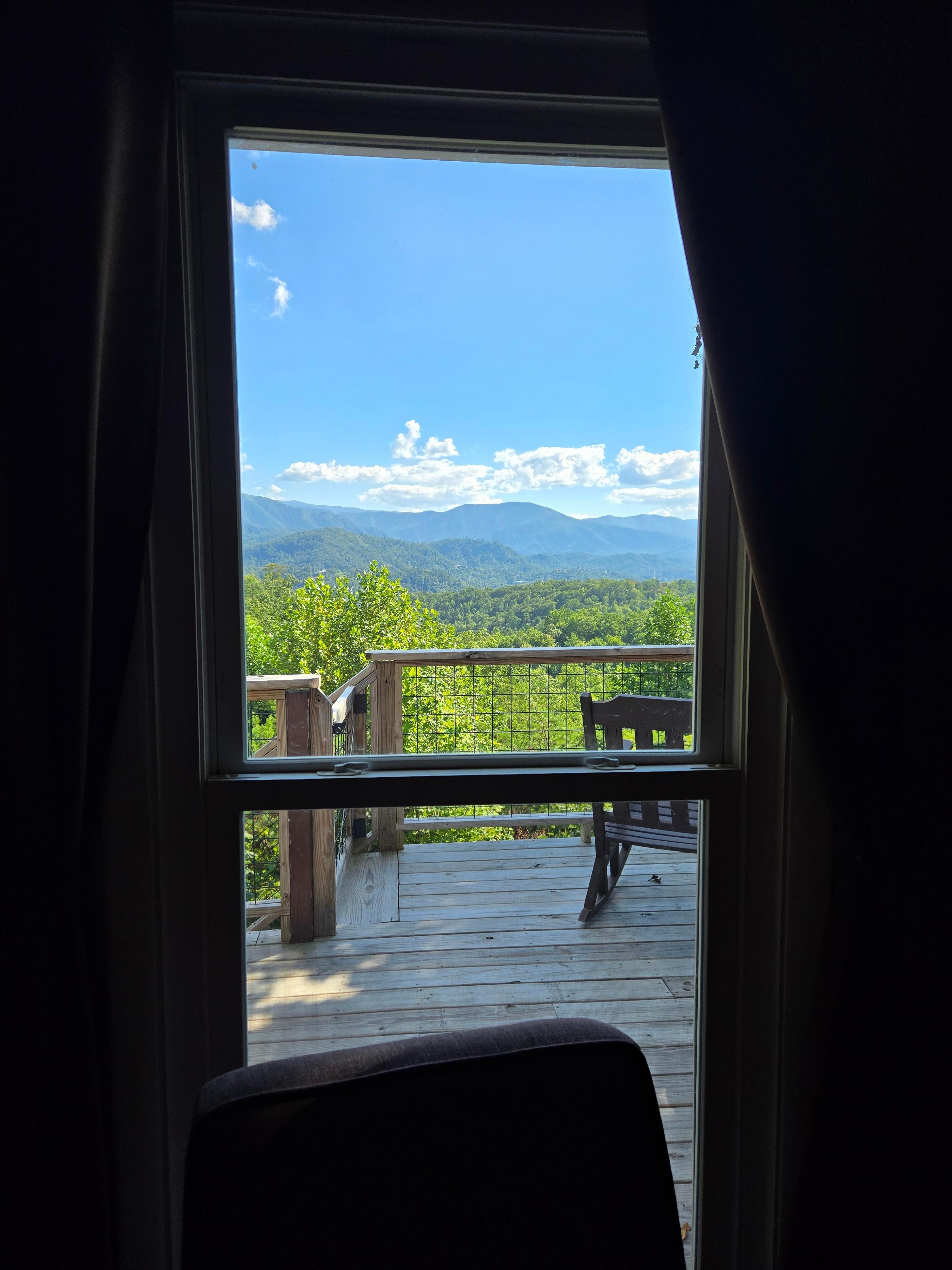 "All About The View" is renovated from roof, exterior, walls, floors, windows, heat and air, appliances, furnishings and more. This is a rare cabin whose view is normally reserved for larger and much more expensive cabins and chalets. Hard to find that "million dollar view" in a smaller sleep-6 cabin. The chalet is very tastefully decorated and offers a wood burning fireplace in Fall and Winter season. Beds are super comfortable and both king sized. A separate floor offers a comfortable futon within a media area room. This room has a 55" big sized flat screen, Spectrum cable and DVD player. The room also has books and a kids play area. (This room has outside access only. No stairs from inside chalet. Perfect for teenagers!)