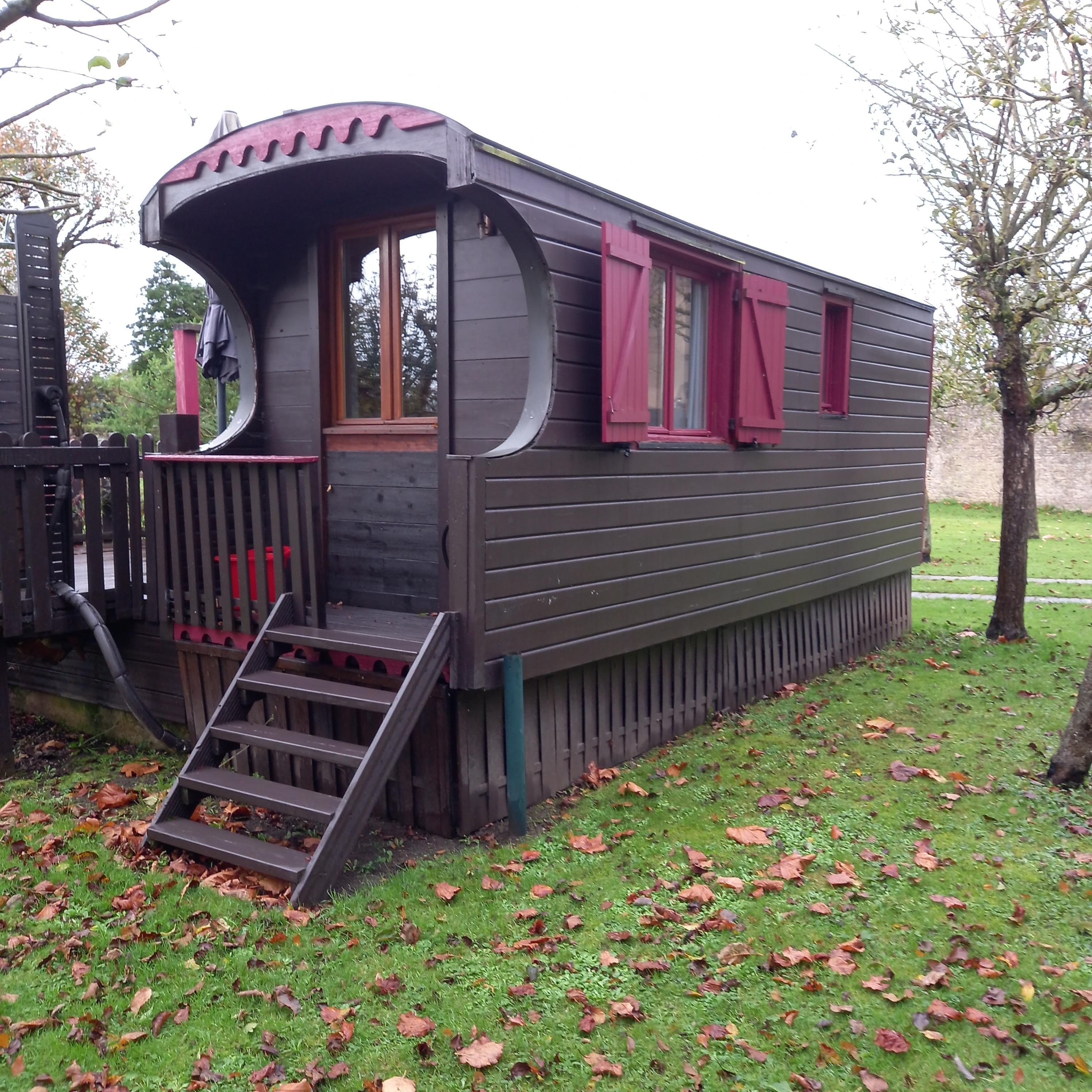 In the heart of the Pommeraie, the Roulotte du Domaine du Manoir has been completely redesigned and oriented on a beautiful wooden terrace facing south and its jacuzzi - spa.