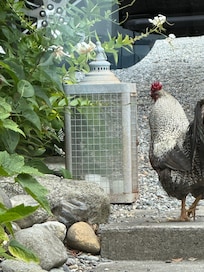 The kitchen is fully appointed. Bedding, linens, propane, firewood, towels, sheets, soaps, coffee, spices, etc. are included. There is also an outdoor patio with a table that seats 12, a propane barbecue, outdoor fireplace and sofa for lounging around it, two hammocks in the yard and two at the beach, a large deck overlooking the water, a duck pond and 2 small water features/fountains, free range rabbits, chickens and ducks, horses in our barn a two minute walk away. Starbuck the miniature horse lives attention so let us know if you would like to meet him.