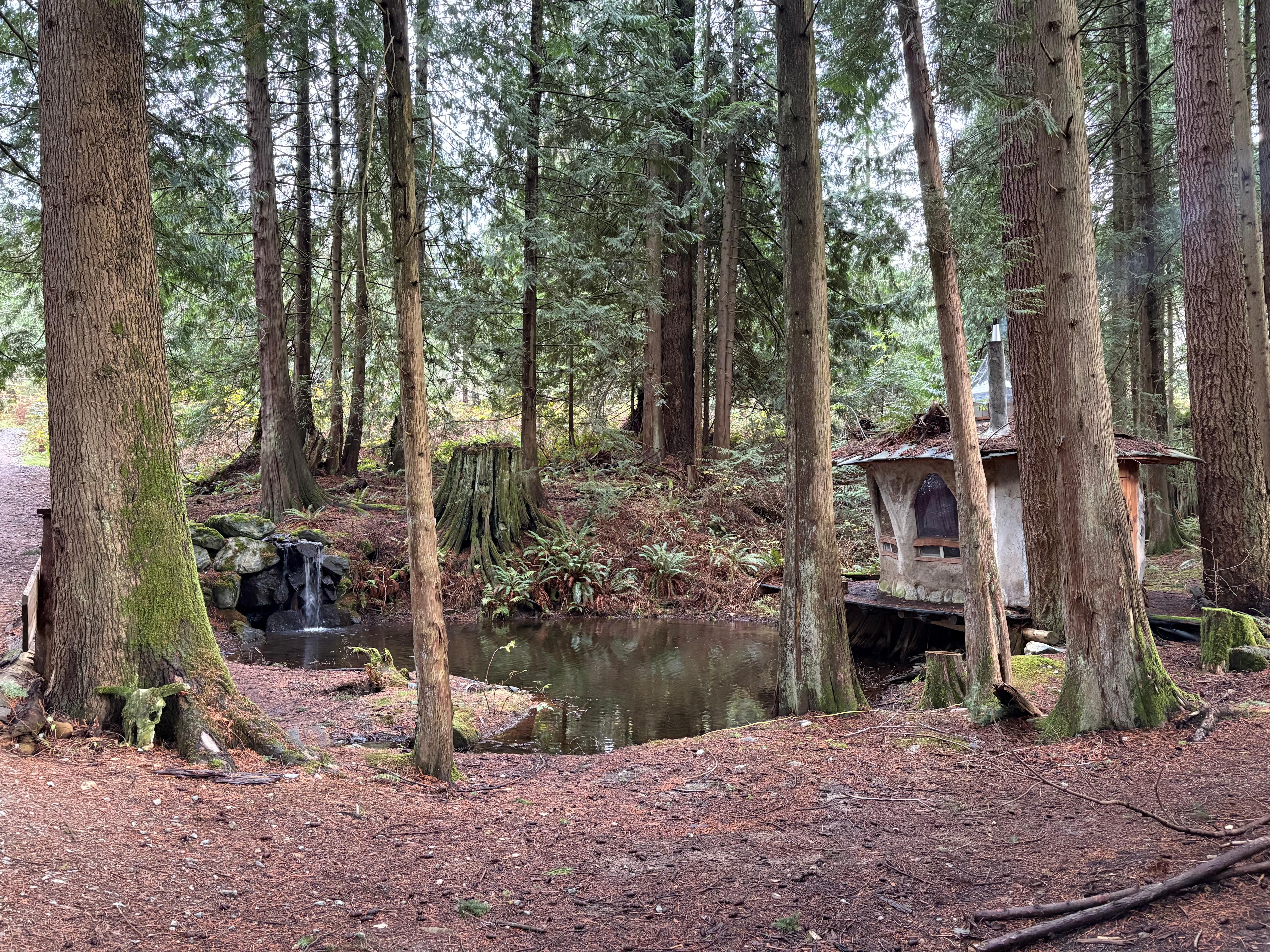 The Stump House ID#1541586 and Mush Room ID#1541712 are adorable little cold water cabins set in a stand of giant fir and cedar trees. Each cabin overlooks a different trout pond. Each cabin has electricity, cold water sink, tea station and wood fired heat in addition to electric heater November through April. The cabins each have a comfortable double bed. The Stump additional has an easy chair that fold out into a small single bed to accomodate a child or third guest. Bring your rain boots fall through spring as the trails get wet and muddy.
