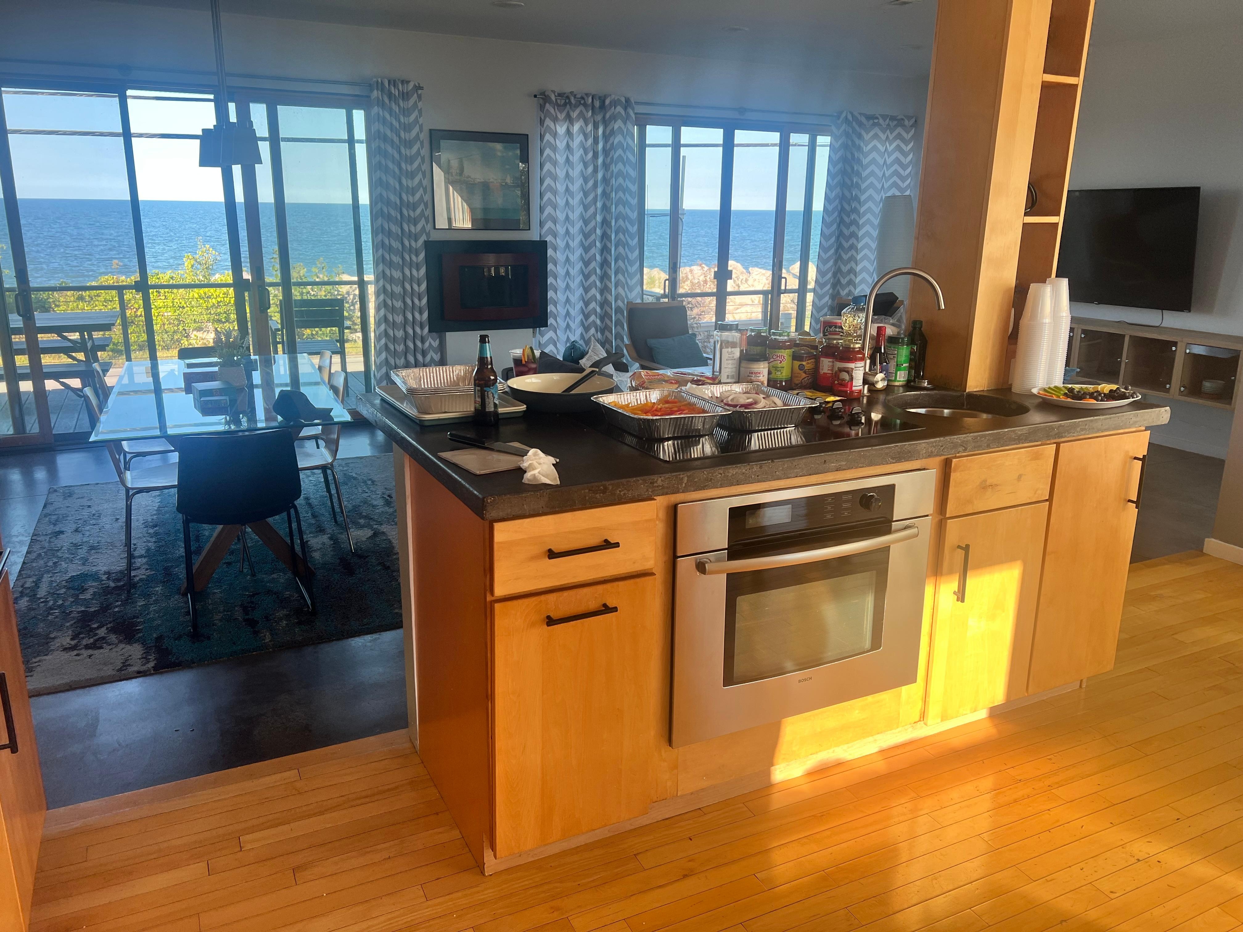The main living area boasts an expansive 24-foot-wide glass wall that opens onto a spacious deck overlooking the lake. Relax in the great room with a large flat-screen TV and fireplace, or step outside to enjoy a BBQ with panoramic water views. The open-concept kitchen, designed for both entertaining and gourmet cooking, features concrete countertops, two prep areas, stainless steel appliances, and warm maple flooring—all while offering the same incredible lake vistas.