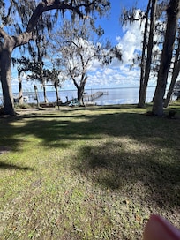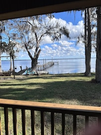 3 bedroom 2 Bath waterfront house approximately 1500 sq feet very open and roomy with approximately 150 ft river frontage located on the beautiful St Johns River. The house has 2 covered porches, one located on the river side with amazing sunrises and beautiful river views. Enjoy seeing lots of wildlife such as Wild Turkeys, Alligators, Manatees, Eagles, Hawks, Owls, Turtles, Birds. Also enjoy watching Hummingbirds feeding from our Hummingbird feeder. House is fully equipped with everything you will need to make your stay amazing. Enjoy your own private dock with a cleaning station to clean your catch. Plenty of room for parking your boats and trailers. House sleeps 8 comfortably and there is room for an air mattresses. (10 Max Occupancy). One boat ramp is less than 1/2 mile from house the larger boat ramp is just 15 minutes away at Crystal Cove Marina.