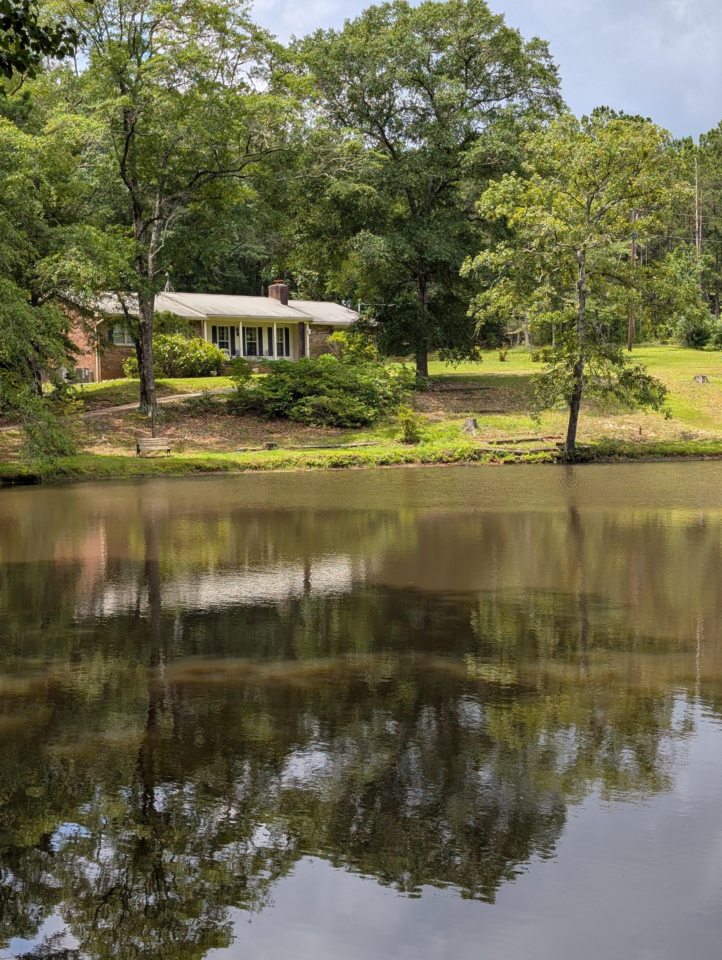 Lovely ranch style home, located in a wooded setting. Very casual atmosphere. Beautiful pond view. The driveway winds across the pond dam and up to the home. Entry is thru the carport and into the kitchen. Internet. Hall bath has shower stall. Master bath has tub/ shower combo. Master and one other bedroom have queen beds. Two twin beds in third bedroom. Livingroom has sofa, 2 swivel glider club chairs, easy chair and a recliner