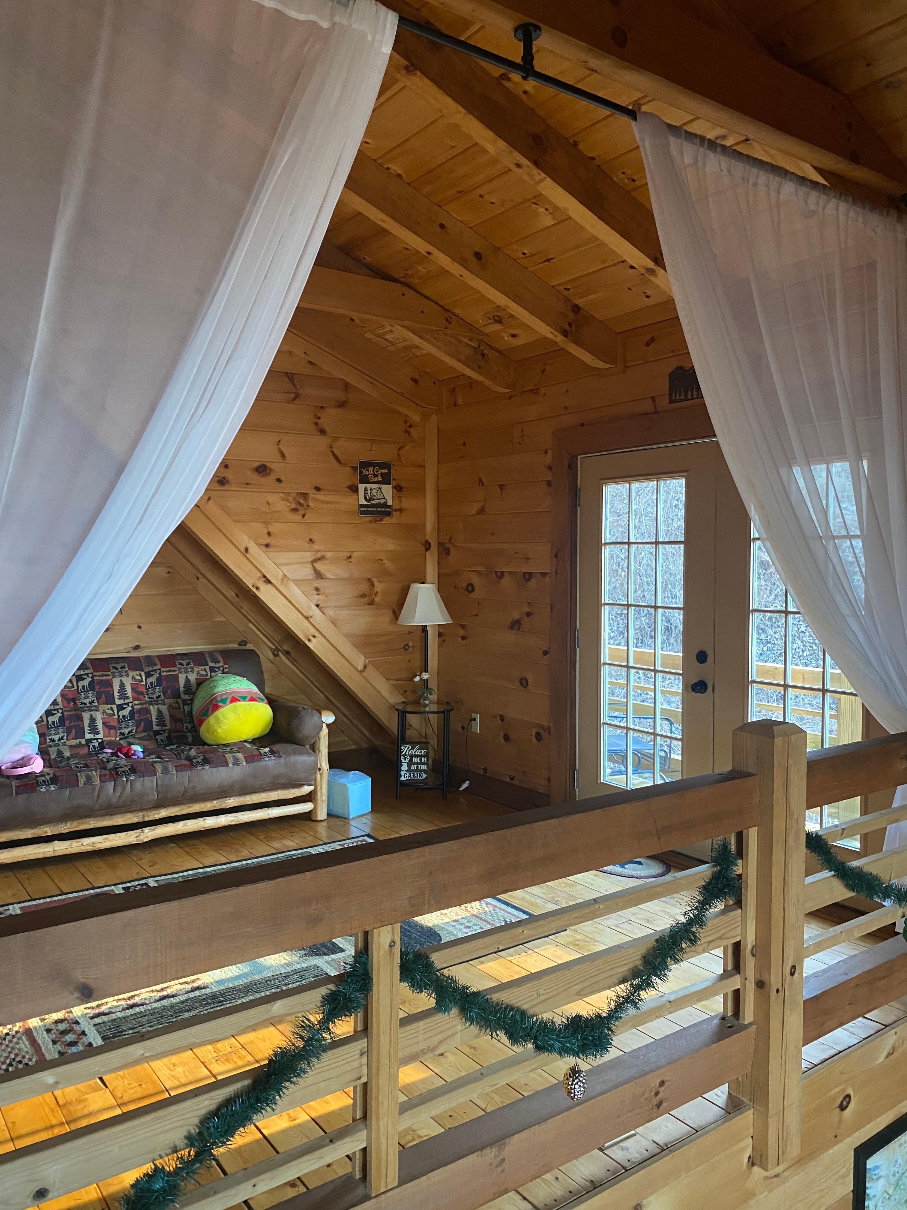 This charming 1-2 bedroom cabin includes a King bed in the downstairs bedroom, a full-size log-frame futon in the loft (VERY comfortable!) and a queen size pull-out leather sofa in the living room to comfortably accommodate 4 guests. The master bedroom is the only room that offers complete privacy.