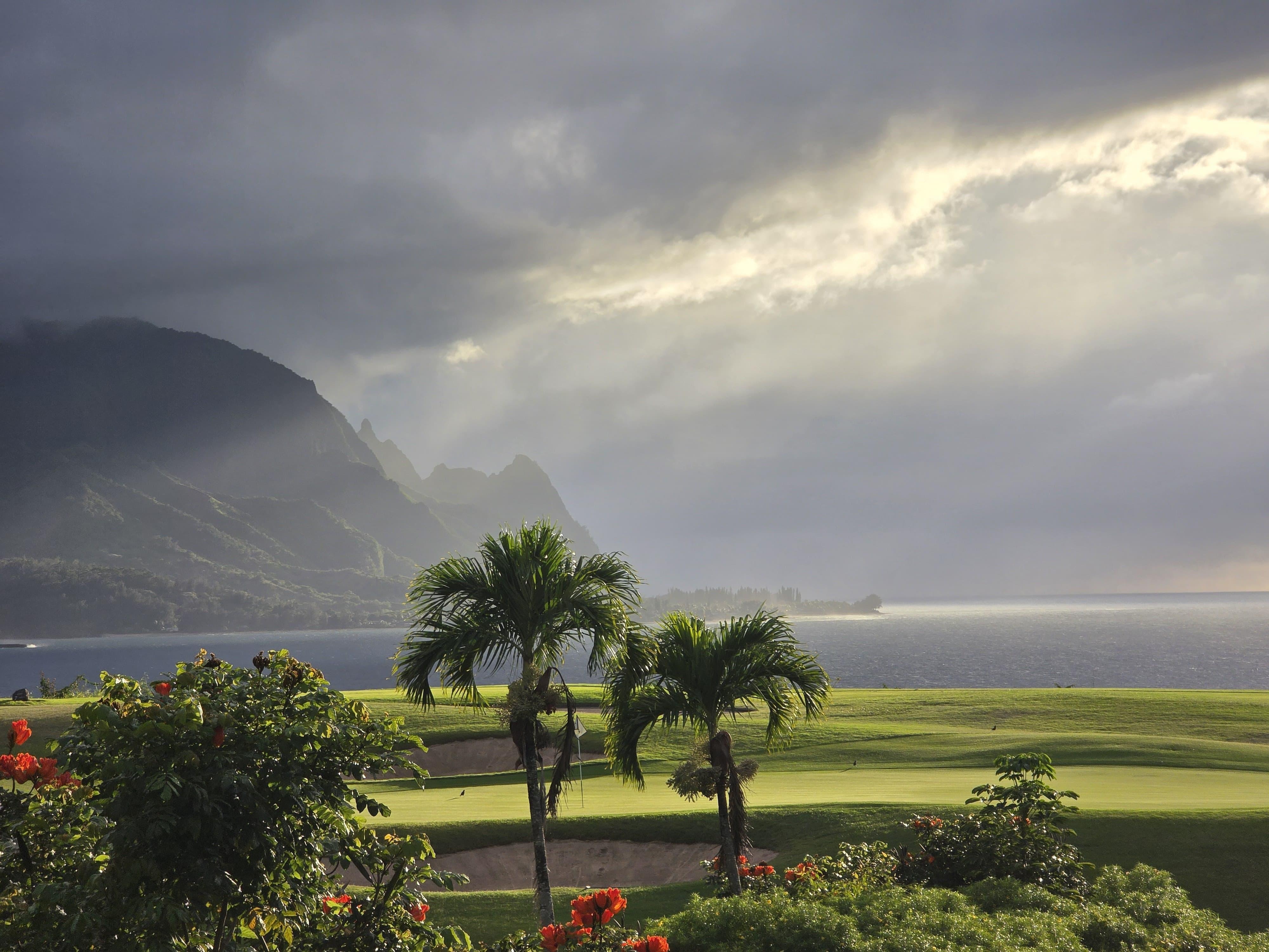 This may be the Hawaiian vacation rental of your dreams. Discover Kauai and the North Shore of Kauai overlooking the outer portions of Hanalai Bay, the Bali Hai and the ocean view holes of the Makai golf course. This vacation rental has not only these water, mountain and golf course views, but proximity to Queen’s Bath, local beaches, and the Princeville shopping center, all within walking distance via Princeville’s walking and biking paths.