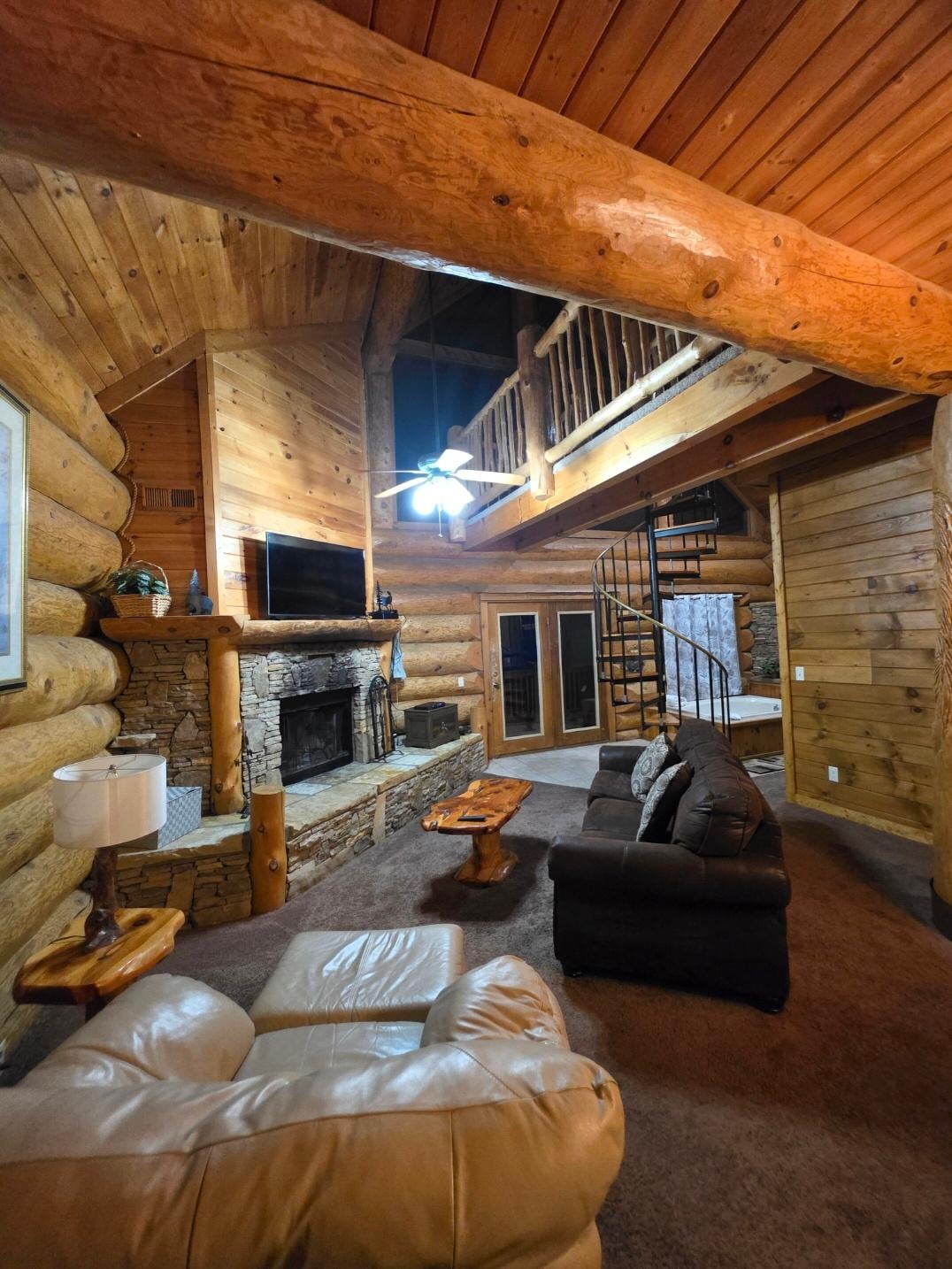 The stunning spiral staircase leads to the upstairs loft room, which has a pool table and a sitting area for entertainment. It provides a pleasant perspective of the rest of the cabin and connects to the arched window where you can take in the breathtaking mountain views from this home via a bridge that looks like wood.