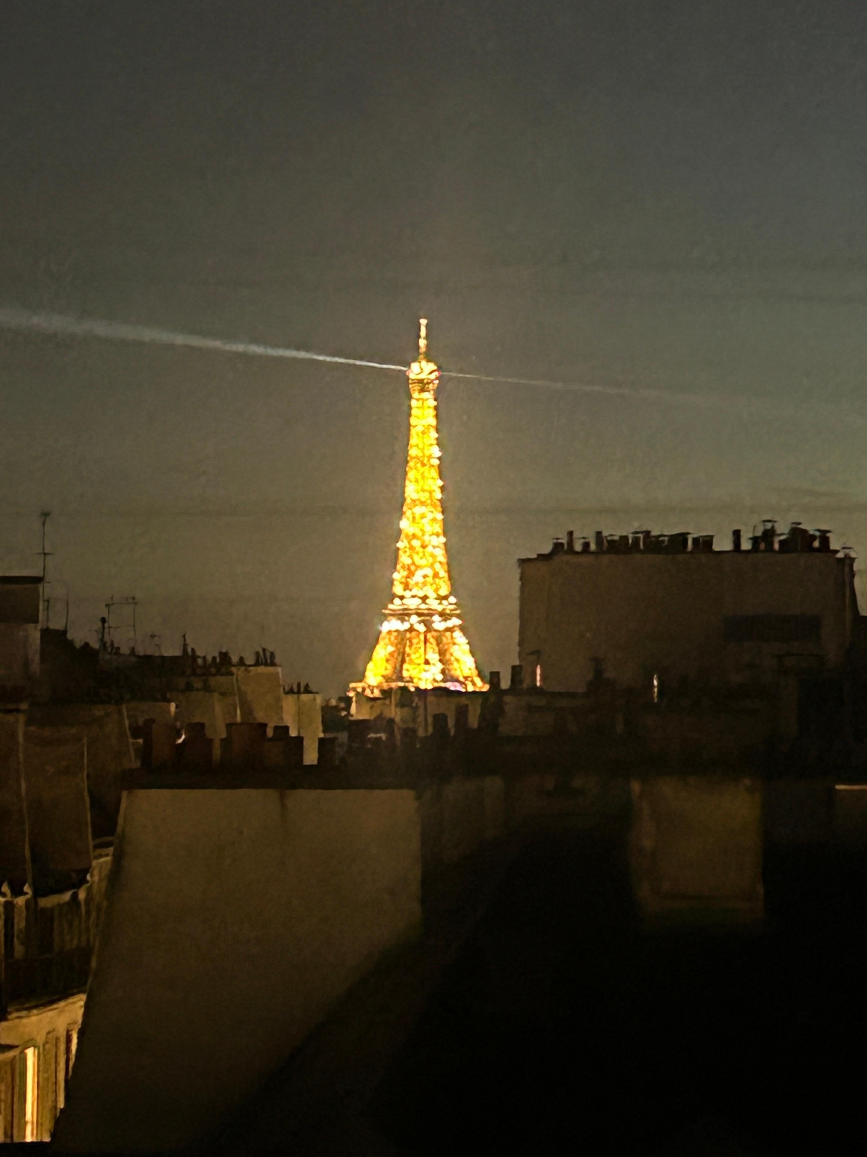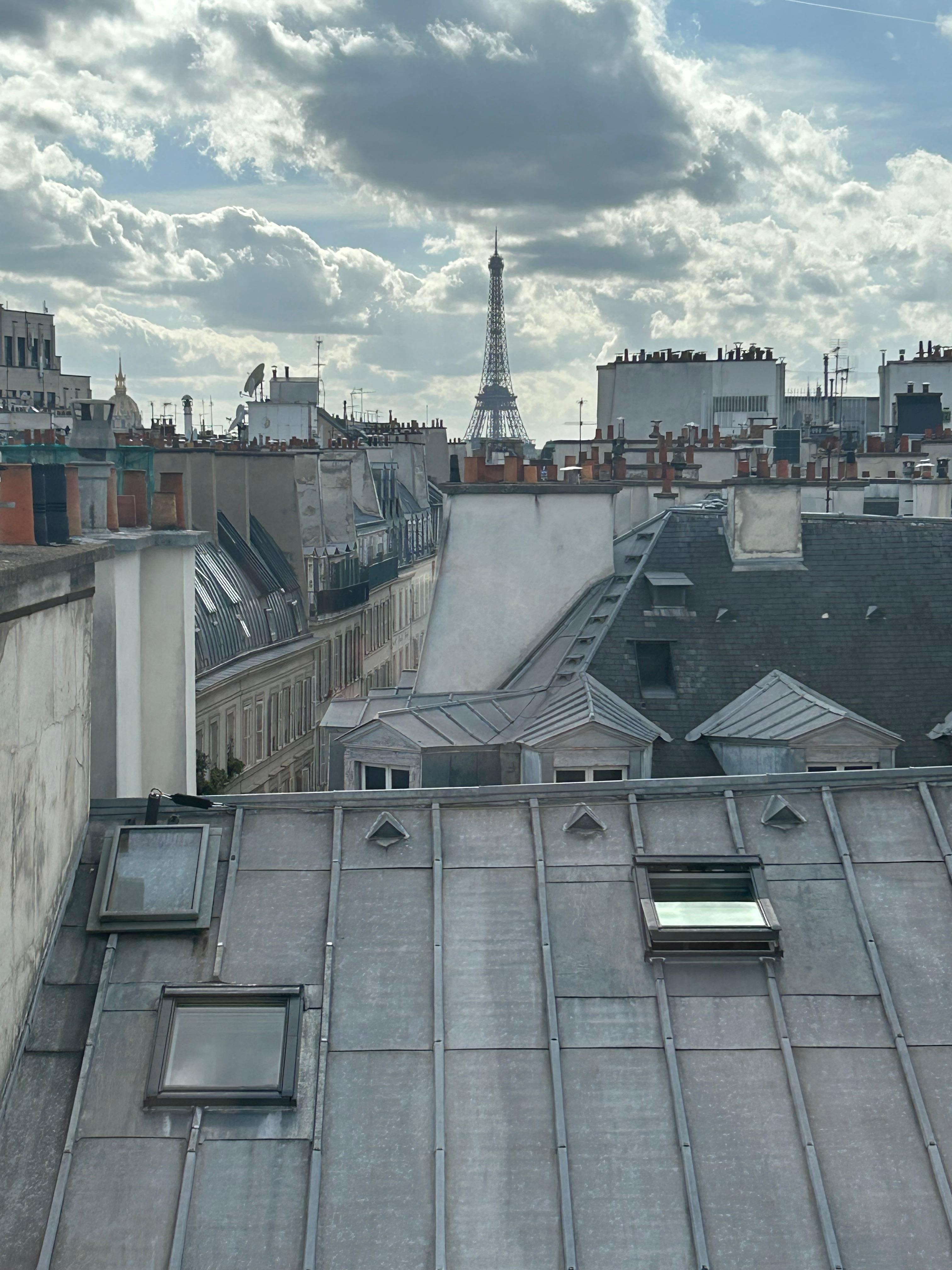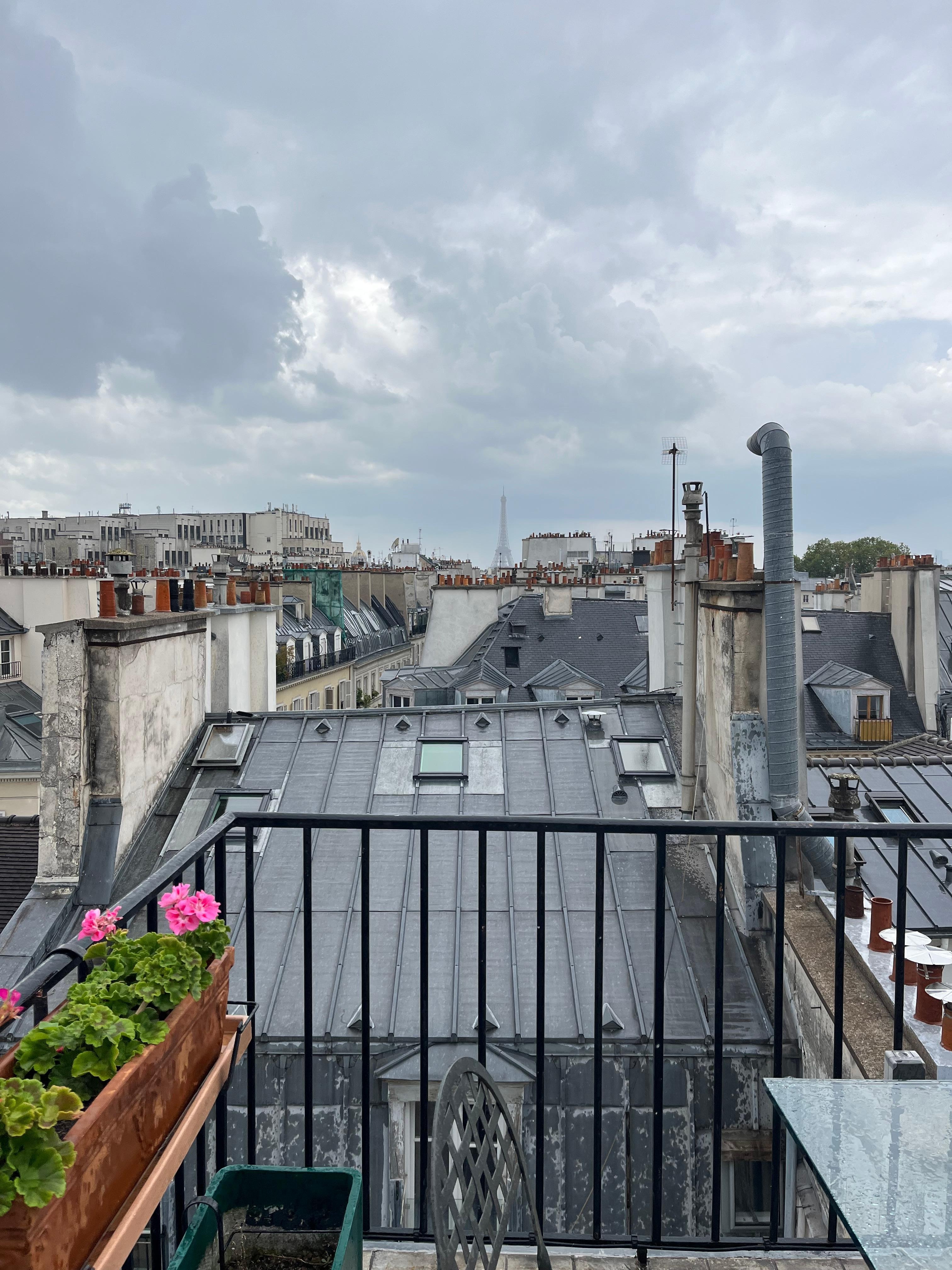 There are 2 bedrooms, one on the lower floor with king bed and ensuite bathroom including a claw-foot tub (with shower over) and WC, and a dressing/laundry room with washer/dryer. The second top-floor queen bedroom, which may once have been used as an artist’s studio, offers an en suite bathroom with shower and WC. This bedroom gives on to a private terrace with stunning views over the rooftops of Paris to the Eiffel Tower, the Louvre, the towers of Notre-Dame and the Sacré-Cœur. The perfect spot to enjoy an evening drink and watch the sun set over the great monuments of the City of Light.