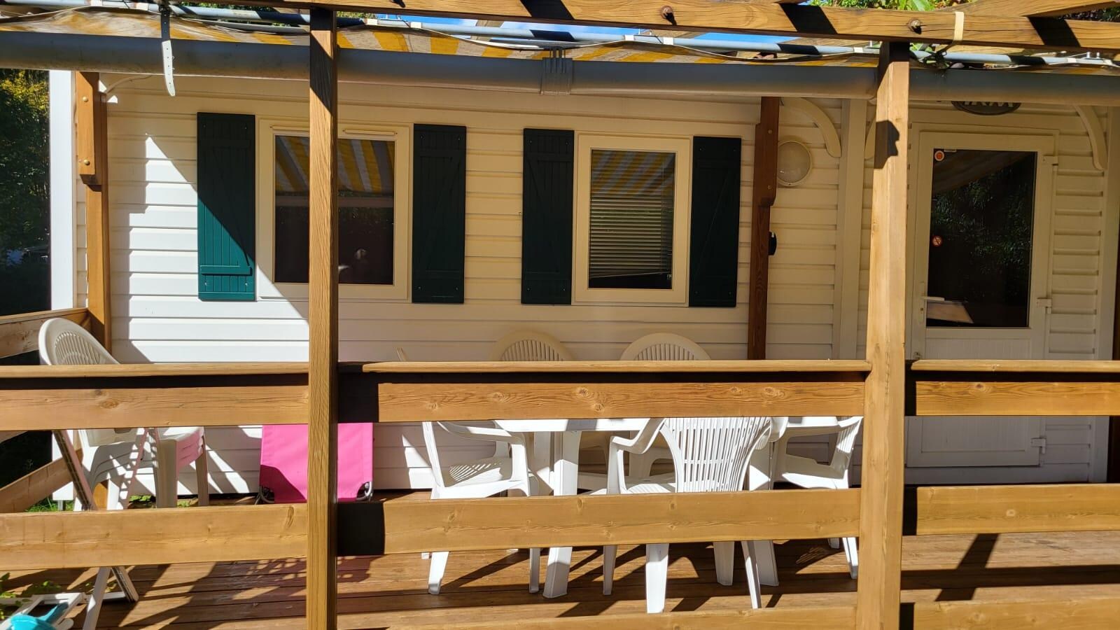 Rent a Mobil Home IRM Super Titania of 30m ² with covered terrace, located on the camp-site "The Ried" TOHAPI classified 3 stars, very equipped including a reversible air-conditioning, television with antenna TNT and access WIFI paying.