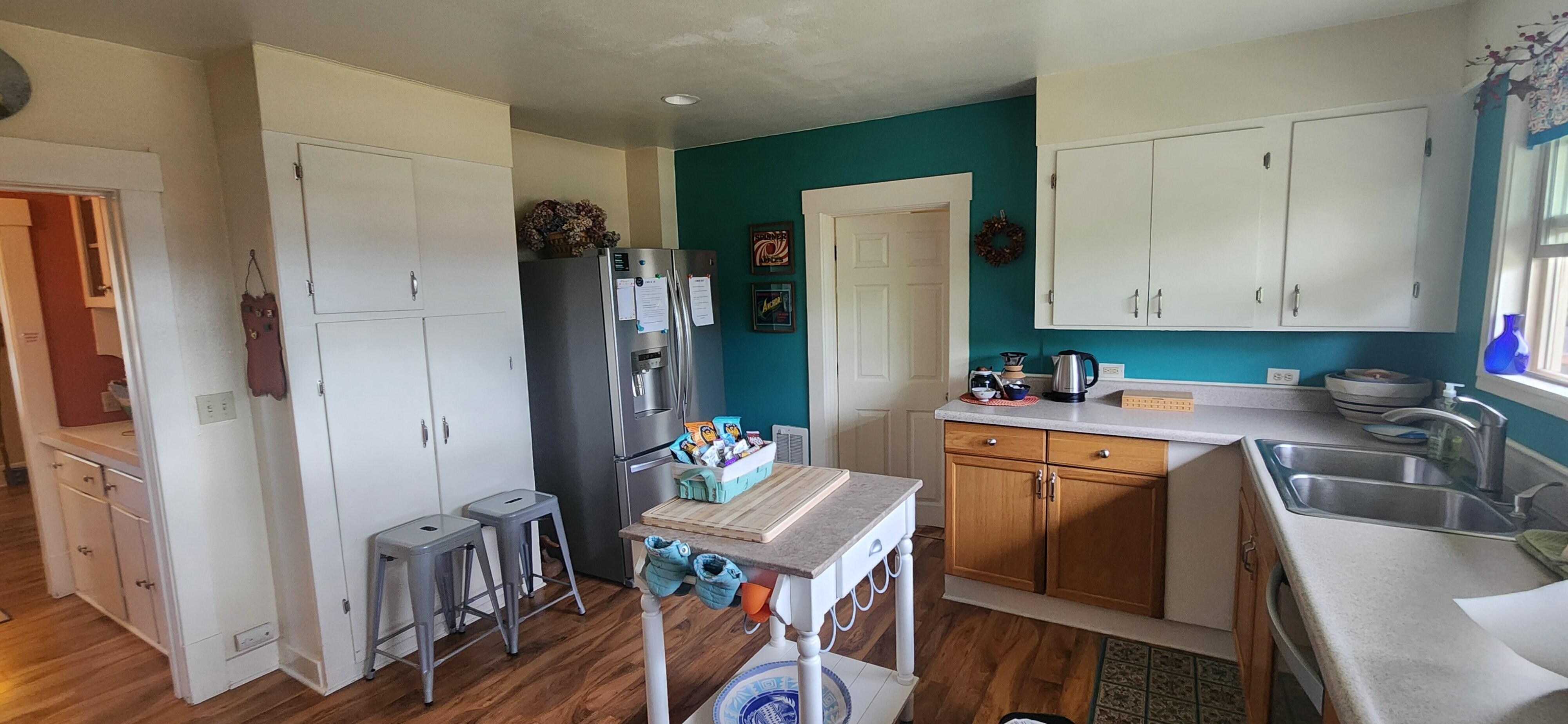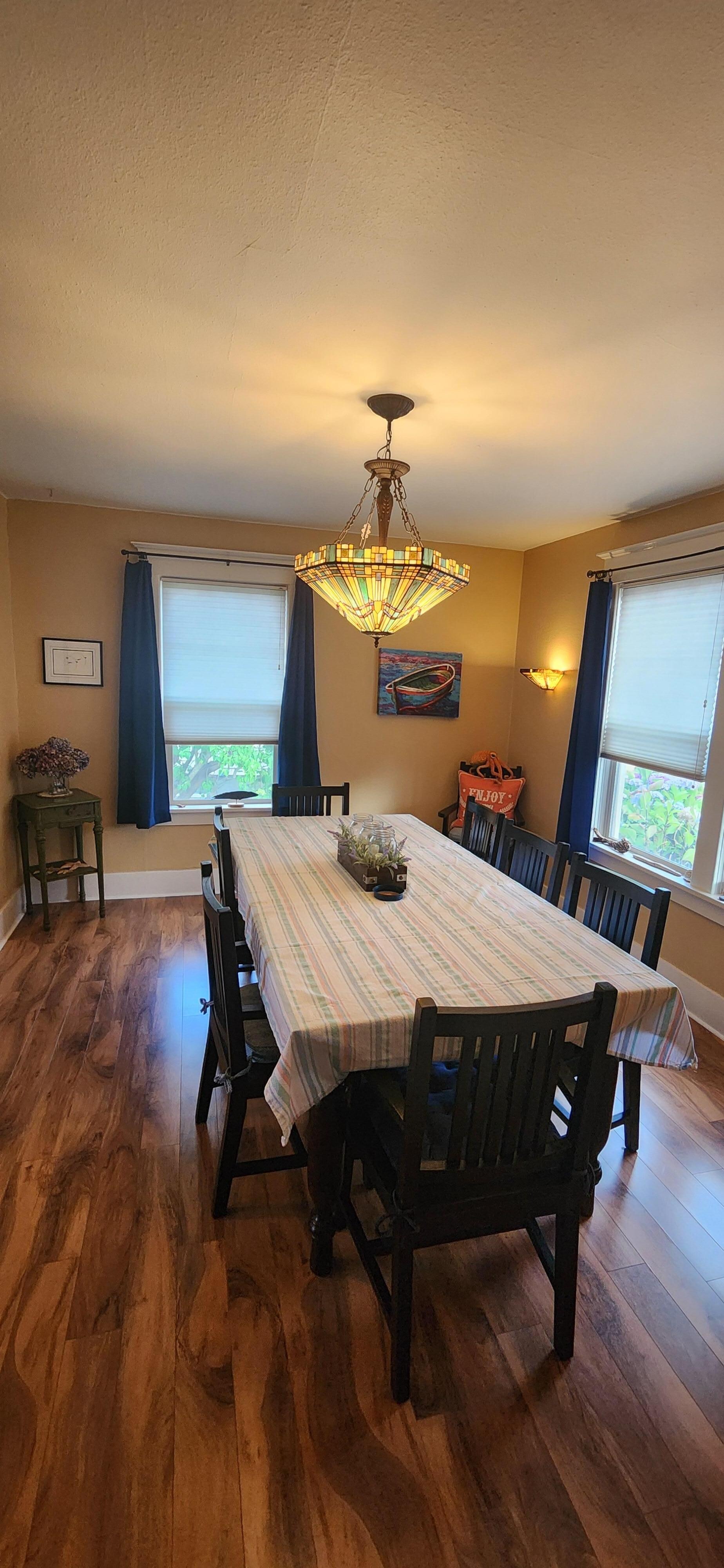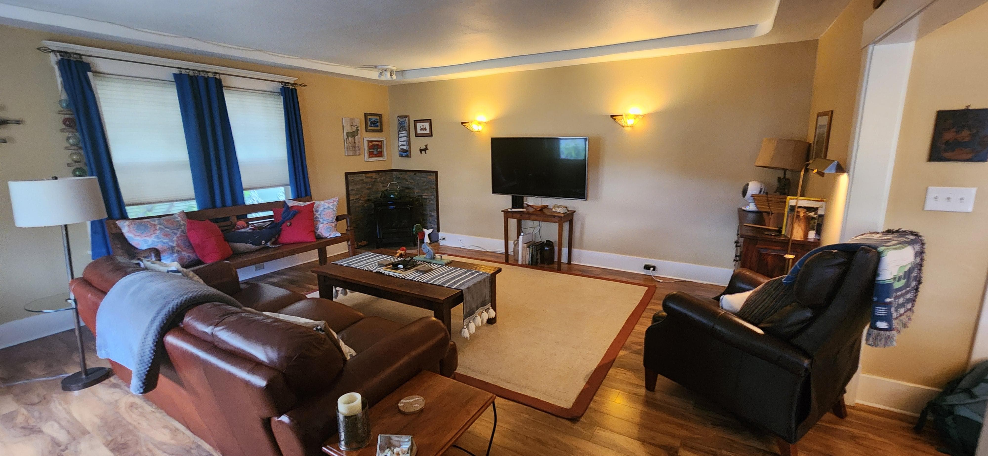 1 King bed with personal half bath downstairs. 2 bedrooms upstairs. 1 bedroom with Queen bed and the other with twin bed.. Full bathroom upstairs is shared. Fully furnished with cookware, laundry, WIFI, TV in living room. Sunny deck with lawn chairs and small barbecue for relaxing while look over large fenced yard with beautiful potted garden.