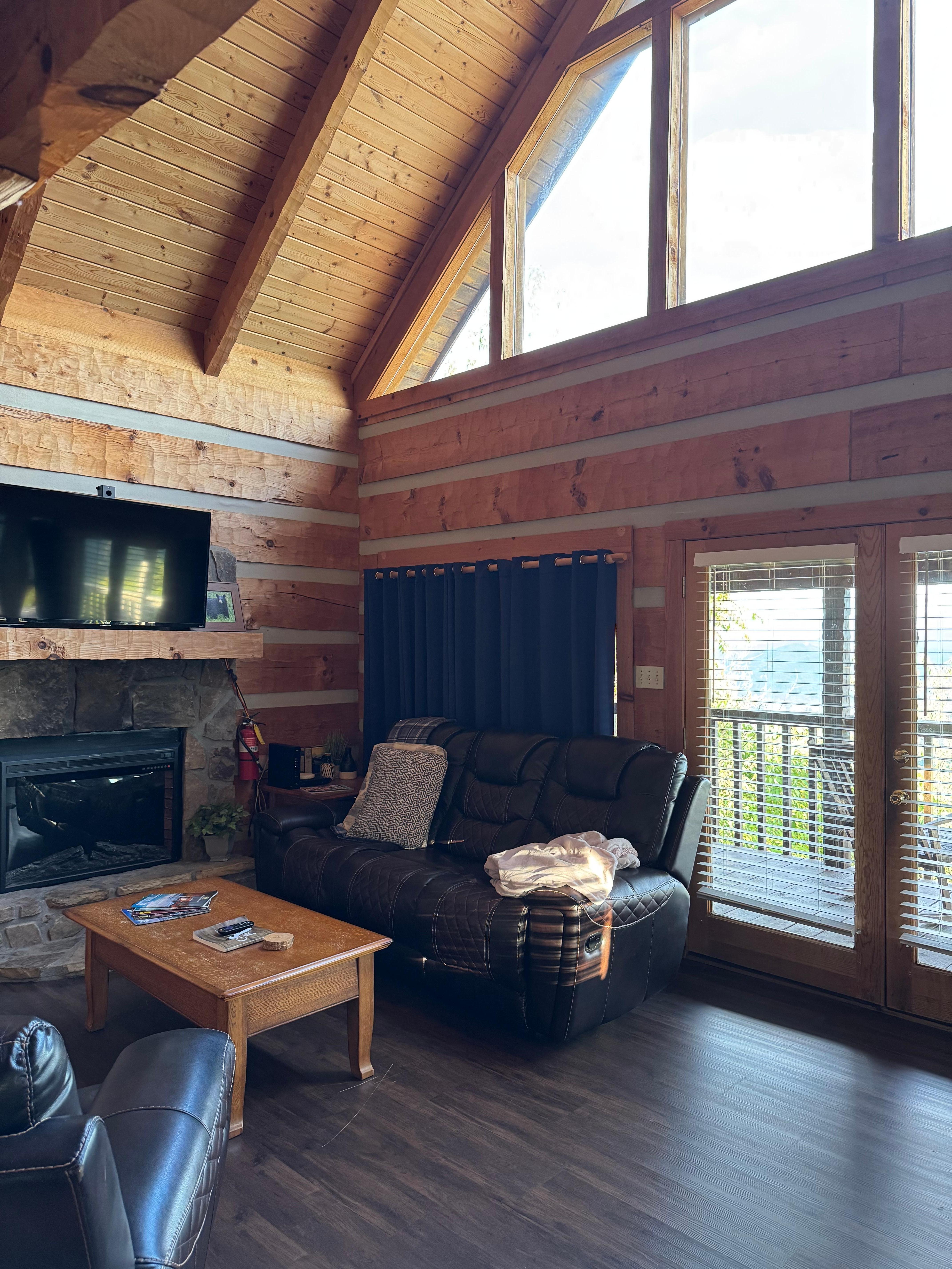 The cabin features an electric fireplace and 1 big screen television. There is a full-sized, fully-equipped kitchen with microwave and coffeemaker and a charcoal cooking grill outside (bring your own charcoal).