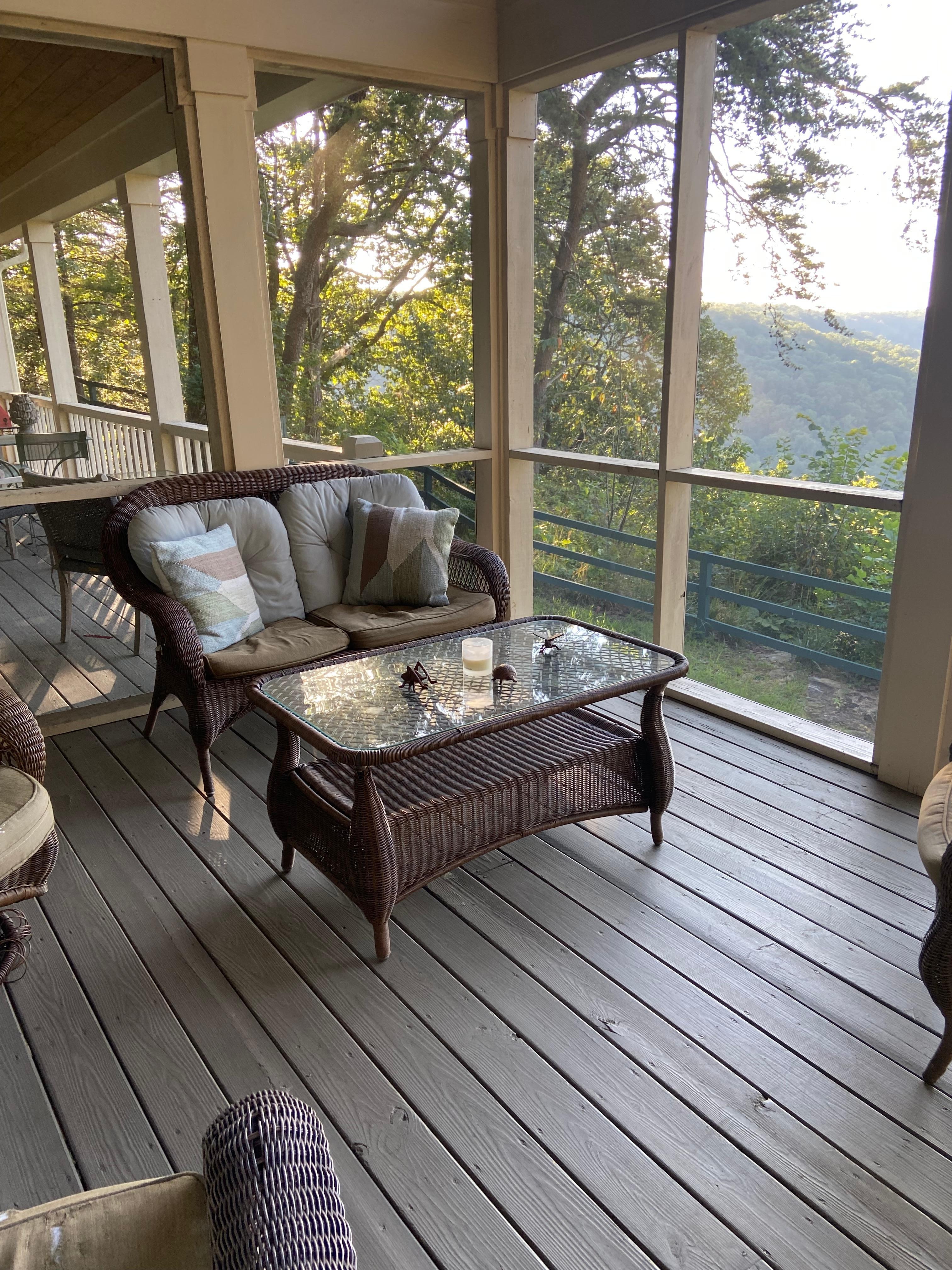 "Mountain View" is a cozy house that features the best view on scenic Monteagle Mountain. This comfortable, 2850 square feet mountain house was built in 2001 and is newly decorated. It is nestled on 5.5 acres, overlooking a dramatic 2000 foot view in Clifftops - between Sewanee and Monteagle, Tennessee. There are 900 added square feet of porch, both screened and open, a vast great room with open kitchen is an exceptional gathering place with vaulted ceiling, large stone, wood-burning fireplace, multiple seating areas and stereo with built-in speakers.