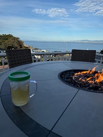 Nearby: world class golf, scenic 17-Mile Drive, Pebble Beach, Carmel and Big Sur. FEATURES: The large, elevated deck has ocean views, a bistro table with a built-in fire pit and seating for six (barbecue in back). The main living area has comfy leather recliner sofas, a bay view windowseat and table for evening games, a den with a sectional and a jumbo TV, and a separate dining area.